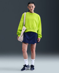 Grounded in style, comfort and versatility, meet our take on luxury loungewear. Our roomiest fit paired with exaggerated details (like the oversized pocket and taller ribbing) ensures this sweatshirt is anything but basic. All that's left to decide is whether to style it with the matching shorts or other pieces from your wardrobe. Benefits - Our midweight brushed fleece feels extra soft on the inside and smooth on the outside, helping you stay cozy while keeping its structured shape. - Dropped shoulder seams and roomy sleeves provide a relaxed, spacious feel. Product Details - Elongated ribbing - Embroidered Swoosh logo - 80% cotton/20% polyester - Machine wash - Imported - Shown: Cyber/Sail - Style: DQ5761-389 SIZE & FIT Model is wearing size S and is 5′7″170cm Oversized fit: exaggerated and spacious Fits large; we recommend ordering a size down