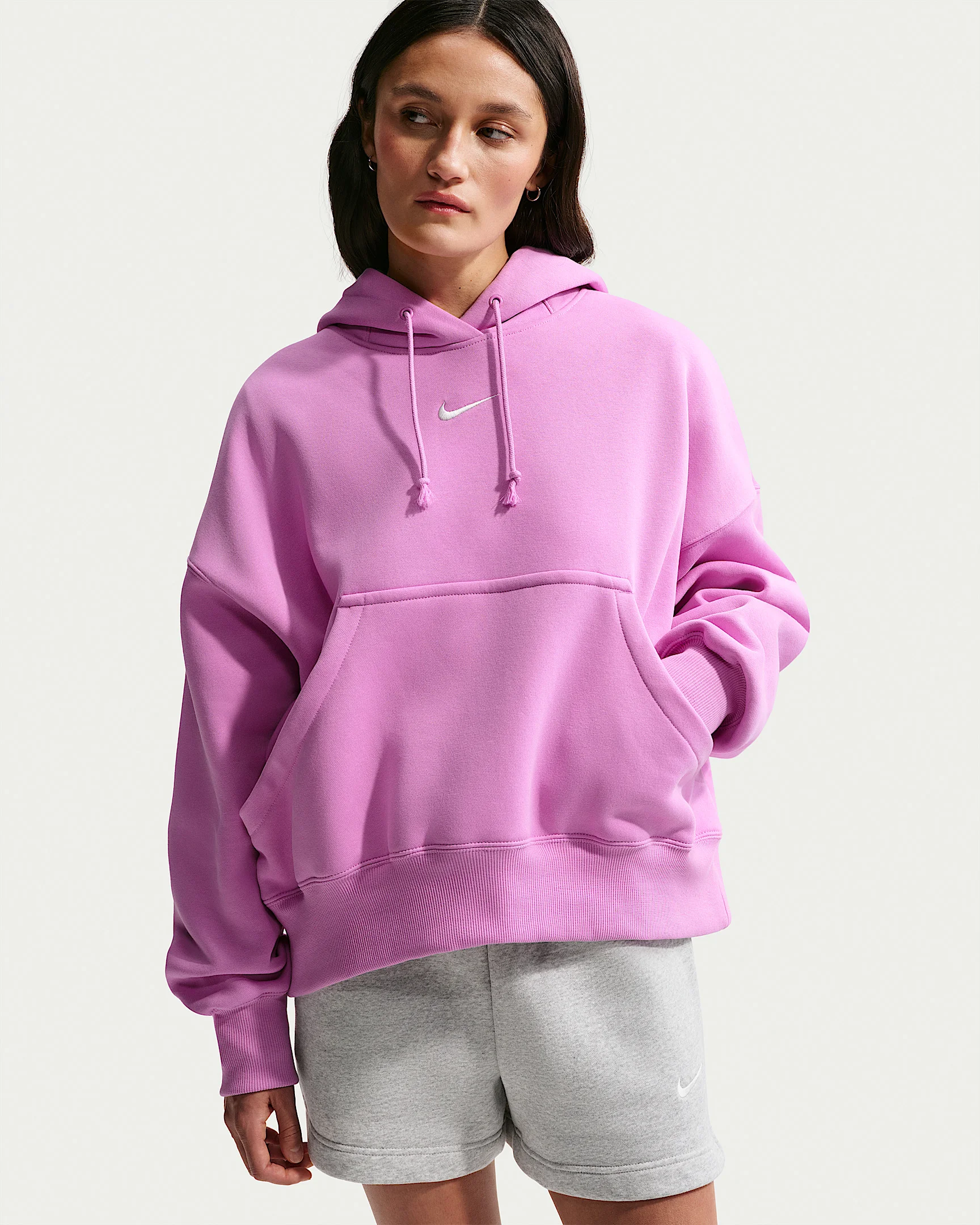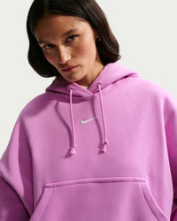 Grounded in style, comfort and versatility, meet our take on luxury loungewear. Our roomiest fit paired with exaggerated details (like the oversized pocket and taller ribbing) ensures this hoodie is anything but basic. All that's left to decide is whether to style it with the matching sweats or other pieces from your wardrobe. Benefits - Our midweight brushed fleece feels extra soft on the inside and smooth on the outside, helping you stay cozy while keeping its structured shape. - Dropped shoulder seams and roomy sleeves provide a relaxed, spacious feel. Product Details - Elongated ribbing - Drawcord hood - Front pocket - Body: 80% Cotton/20% Polyester. Hood lining: 100% Cotton. - Machine wash - Imported - Shown: Light Magenta/Sail - Style: DQ5858-503 SIZE & FIT Oversized fit: exaggerated and spacious Fits large; we recommend ordering a size down