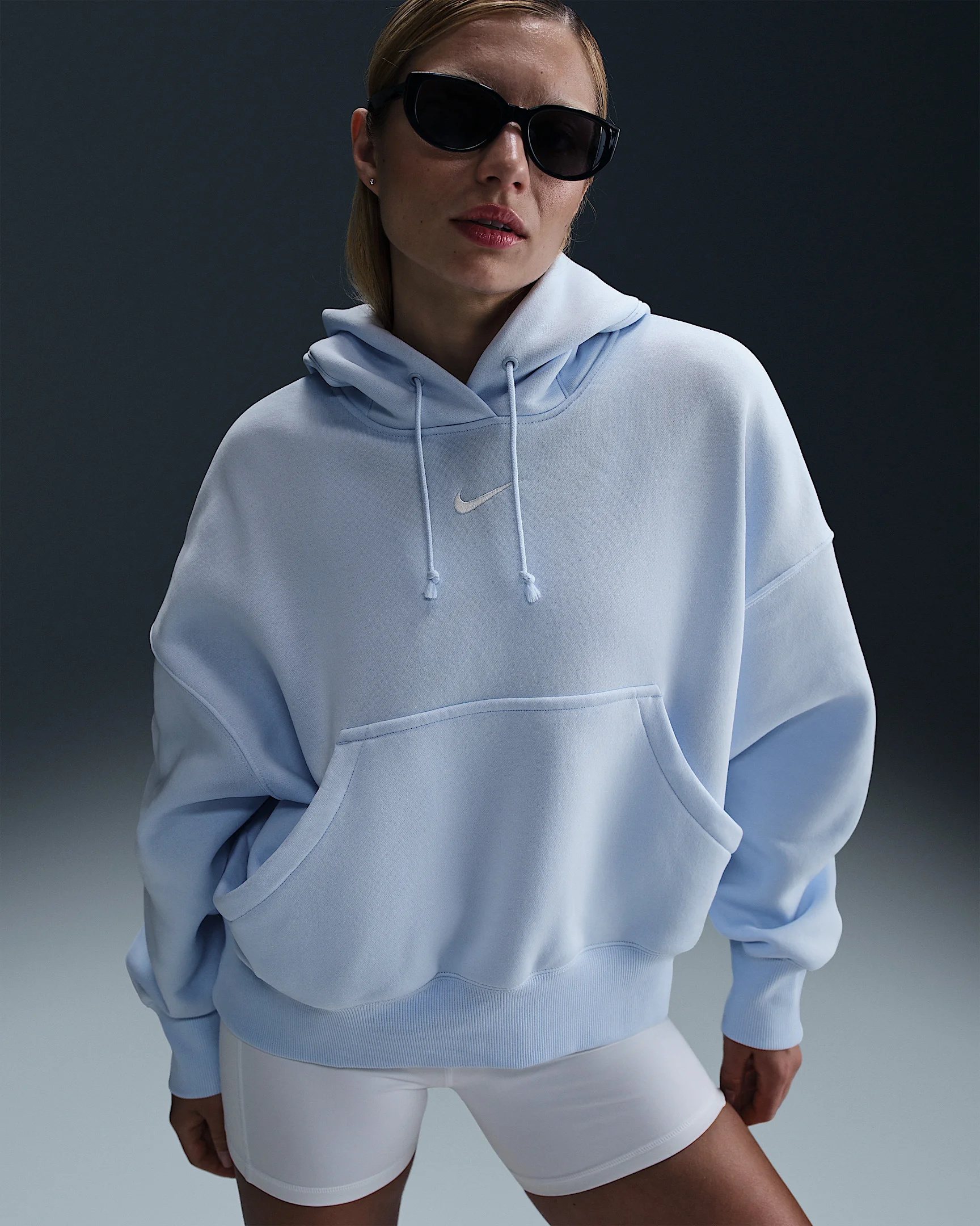 Grounded in style, comfort and versatility, meet our take on luxury loungewear. Our roomiest fit paired with exaggerated details (like the oversized pocket and taller ribbing) ensures this hoodie is anything but basic. All that's left to decide is whether to style it with the matching sweats or other pieces from your wardrobe. Benefits - Our midweight brushed fleece feels extra soft on the inside and smooth on the outside, helping you stay cozy while keeping its structured shape. - Dropped shoulder seams and roomy sleeves provide a relaxed, spacious feel. Product Details - Elongated ribbing - Drawcord hood - Front pocket - Body: 80% Cotton/20% Polyester. Hood lining: 100% Cotton. - Machine wash - Imported - Shown: Blue Tint/Sail - Style: DQ5858-423 SIZE & FIT Model is wearing size S and is 5′10″178cm Oversized fit: exaggerated and spacious Fits large; we recommend ordering a size down