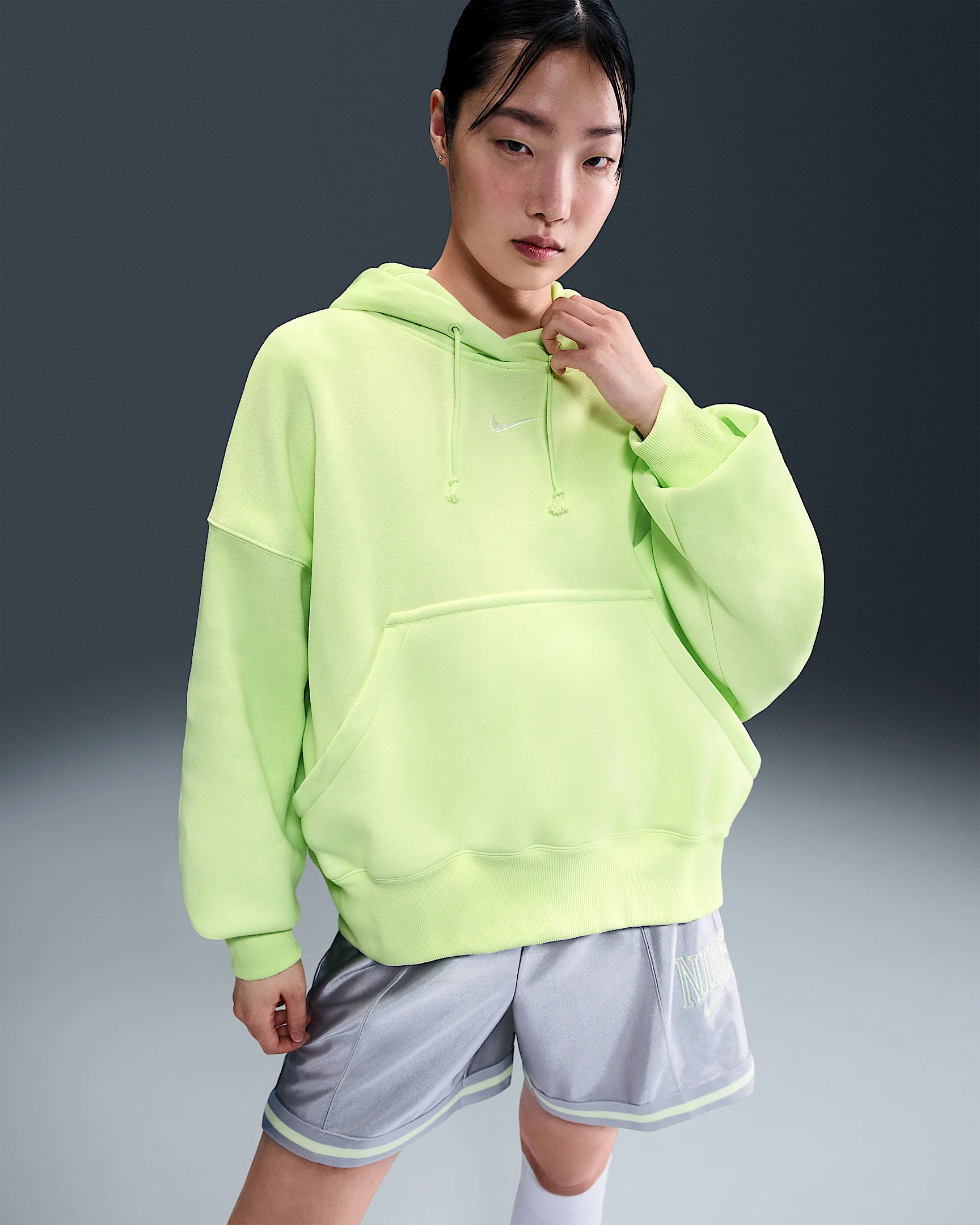 Grounded in style, comfort and versatility, meet our take on luxury loungewear. Our roomiest fit paired with exaggerated details (like the oversized pocket and taller ribbing) ensures this hoodie is anything but basic. All that's left to decide is whether to style it with the matching sweats or other pieces from your wardrobe. Benefits - Our midweight brushed fleece feels extra soft on the inside and smooth on the outside, helping you stay cozy while keeping its structured shape. - Dropped shoulder seams and roomy sleeves provide a relaxed, spacious feel. Product Details - Elongated ribbing - Drawcord hood - Front pocket - Body: 80% Cotton/20% Polyester. Hood lining: 100% Cotton. - Machine wash - Imported - Shown: Light Liquid Lime/Sail - Style: DQ5858-360 SIZE & FIT Model is wearing size S and is 5′9″175cm Oversized fit: exaggerated and spacious Fits large; we recommend ordering a size down