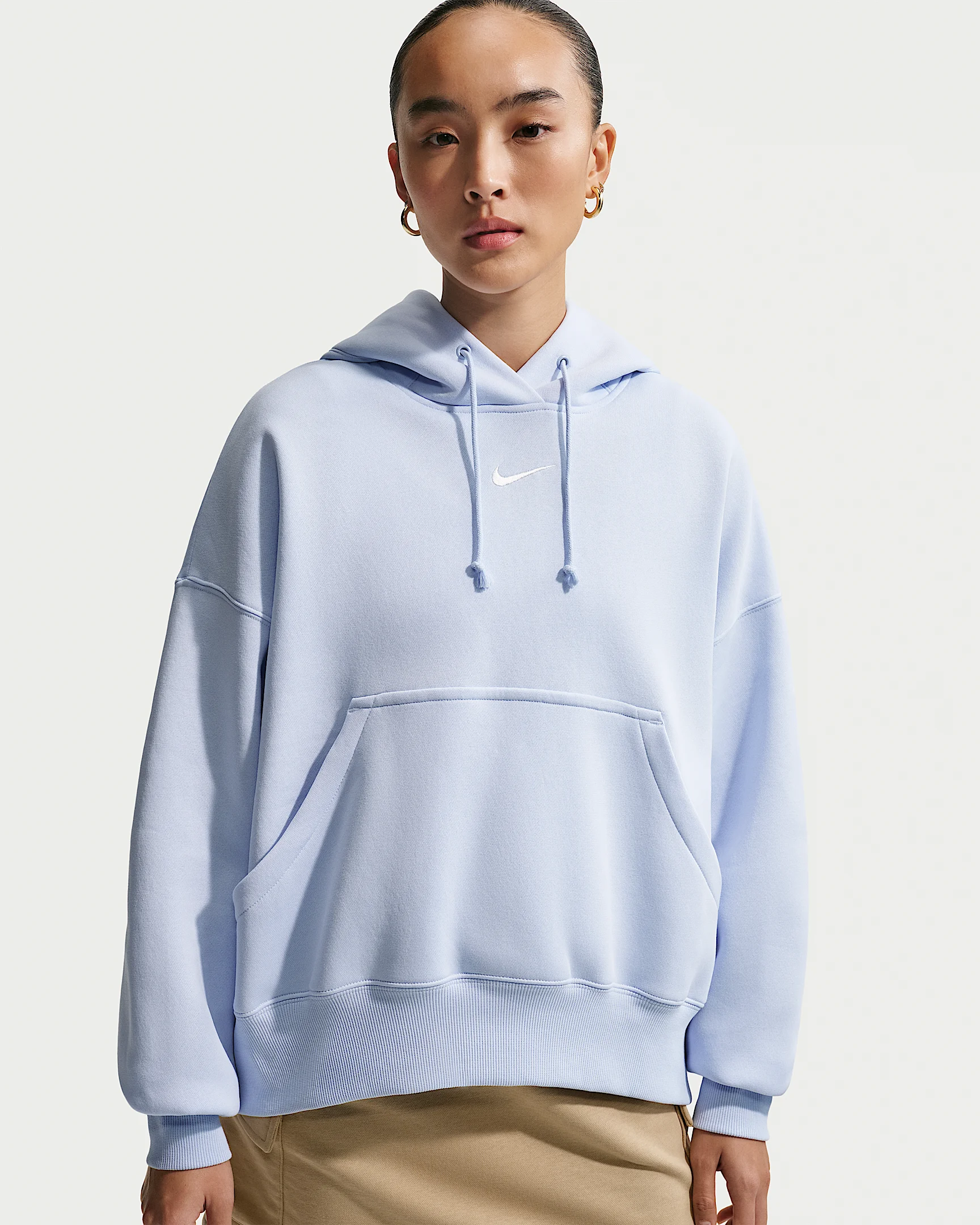 Grounded in style, comfort and versatility, meet our take on luxury loungewear. Our roomiest fit paired with exaggerated details (like the oversized pocket and taller ribbing) ensures this hoodie is anything but basic. All that's left to decide is whether to style it with the matching sweats or other pieces from your wardrobe. Benefits - Our midweight brushed fleece feels extra soft on the inside and smooth on the outside, helping you stay cozy while keeping its structured shape. - Dropped shoulder seams and roomy sleeves provide a relaxed, spacious feel. Product Details - Elongated ribbing - Drawcord hood - Front pocket - Body: 80% Cotton/20% Polyester. Hood lining: 100% Cotton. - Machine wash - Imported - Shown: Hydrogen Blue/Sail - Style: DQ5858-407 SIZE & FIT Model is wearing size M and is 5′11″180cm Oversized fit: exaggerated and spacious Fits large; we recommend ordering a size down