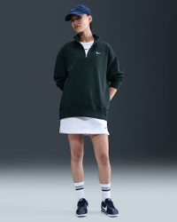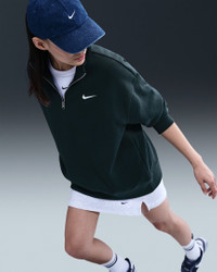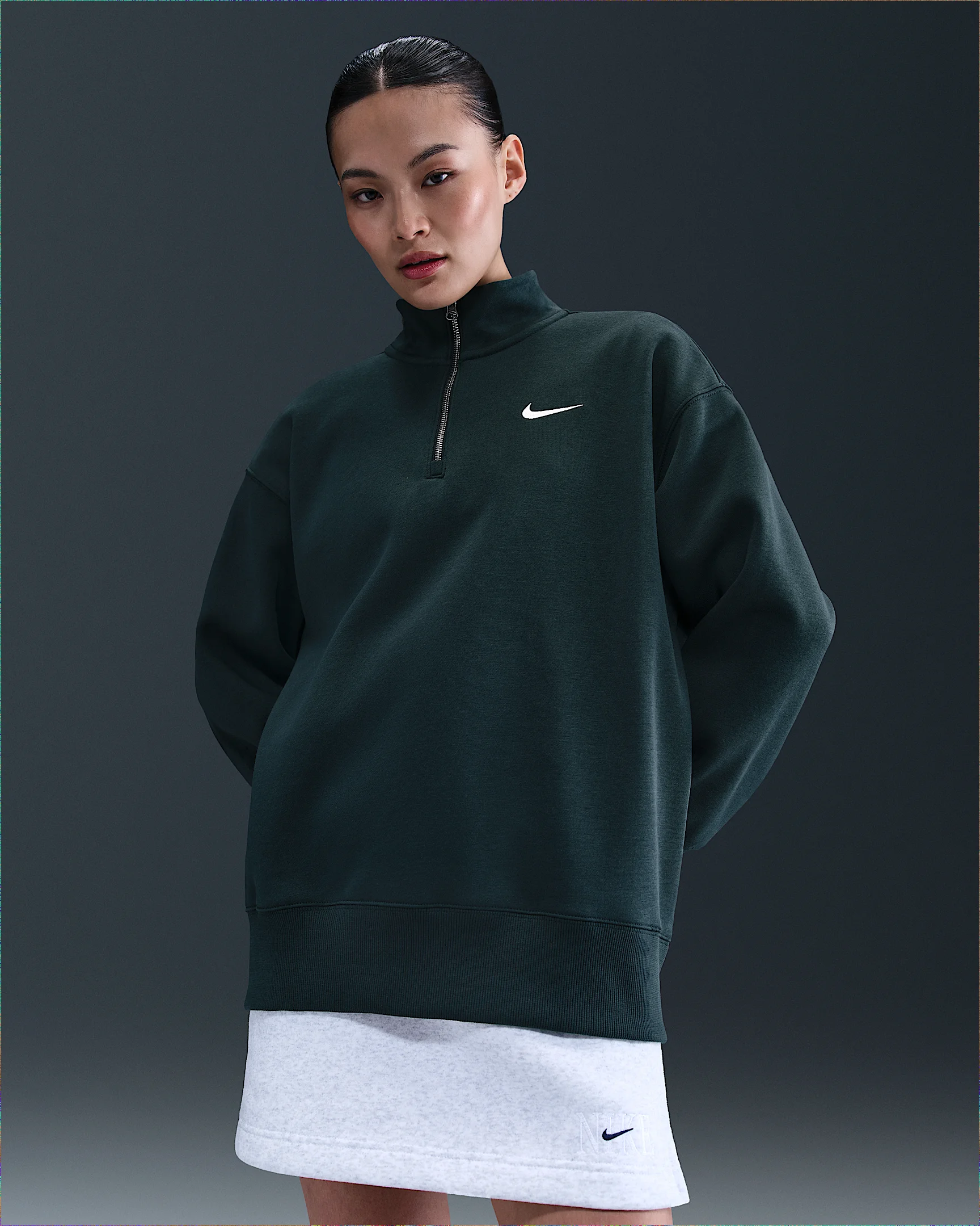 This cozy fleece 1/4-zip sweatshirt feels extra soft on the inside and smooth on the outside. Dropped shoulders and extra-wide ribbing enhance the oversized, extra-long look. Product Details - Body: 80% cotton/20% polyester. Rib: 97% cotton/3% spandex. - Embroidered Swoosh logo on left chest - Machine wash - Imported - Shown: Seaweed/Sail - Style: HJ0931-390 SIZE & FIT Model is wearing size S and is 5′7″170cm Oversized fit: exaggerated and spacious