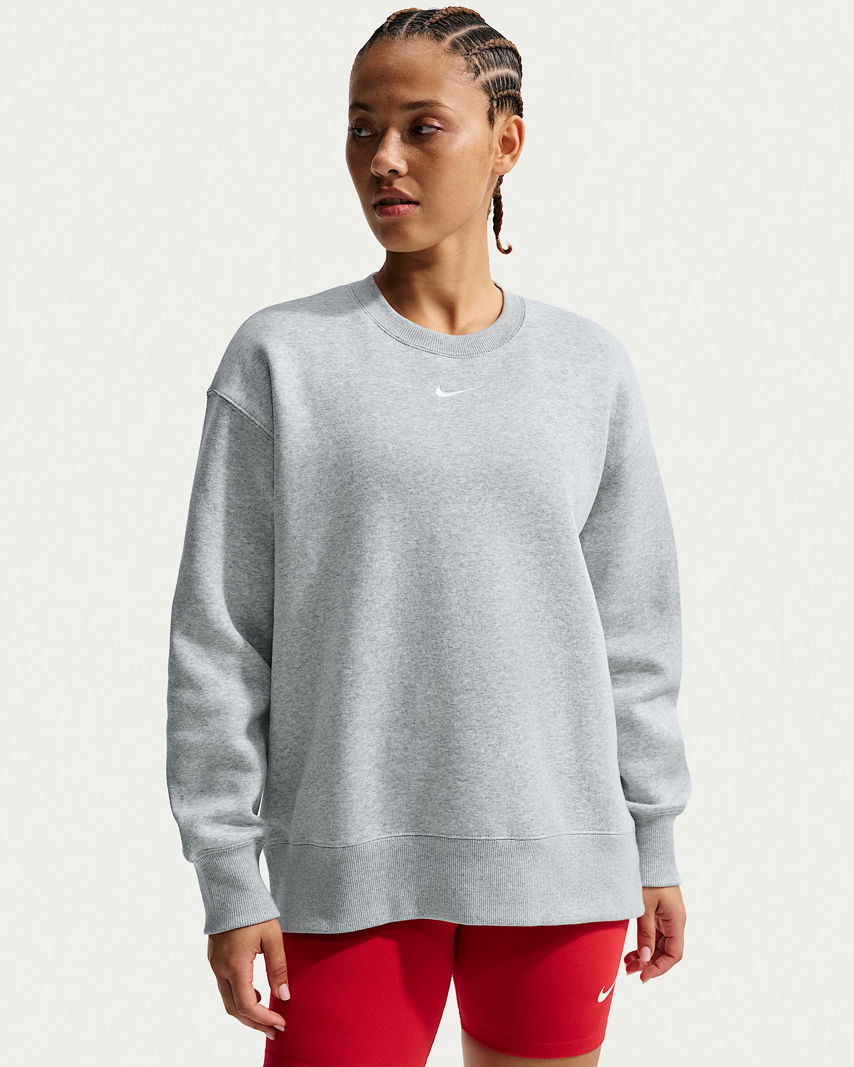 This cozy fleece sweatshirt feels extra soft on the inside and smooth on the outside. Dropped shoulders and extra-wide ribbing enhance the oversized look. Product Details - Body: 80% cotton/20% polyester. Rib: 97% cotton/3% spandex. - Embroidered Swoosh logo at center chest - Machine wash - Imported - Shown: Pure Platinum/Heather/Sail - Style: FZ4270-043 SIZE & FIT Model is wearing size S and is 5′10″178cm Oversized fit: exaggerated and spacious