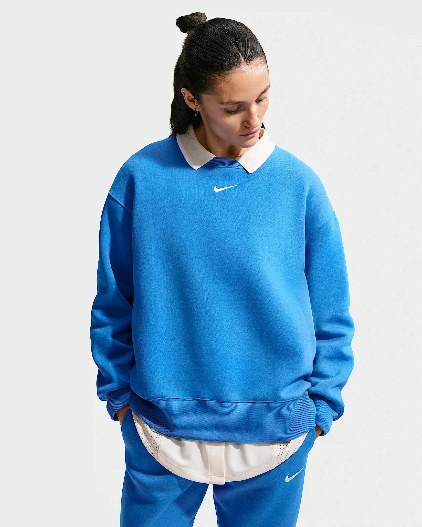 This cozy fleece sweatshirt feels extra soft on the inside and smooth on the outside. Dropped shoulders and extra-wide ribbing enhance the oversized look. Product Details - Body: 80% cotton/20% polyester. Rib: 97% cotton/3% spandex. - Embroidered Swoosh logo at center chest - Machine wash - Imported - Shown: Light Photo Blue/Sail - Style: FZ4270-435 SIZE & FIT Oversized fit: exaggerated and spacious Fits large; we recommend ordering a size down