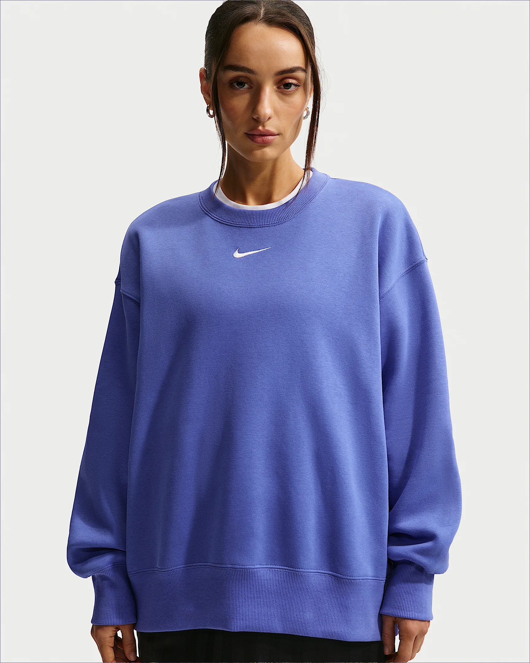 This cozy fleece sweatshirt feels extra soft on the inside and smooth on the outside. Dropped shoulders and extra-wide ribbing enhance the oversized look. Product Details - Body: 80% cotton/20% polyester. Rib: 97% cotton/3% spandex. - Embroidered Swoosh logo at center chest - Machine wash - Imported - Shown: Light Medium Blue/Sail - Style: FZ4270-460 SIZE & FIT Oversized fit: exaggerated and spacious