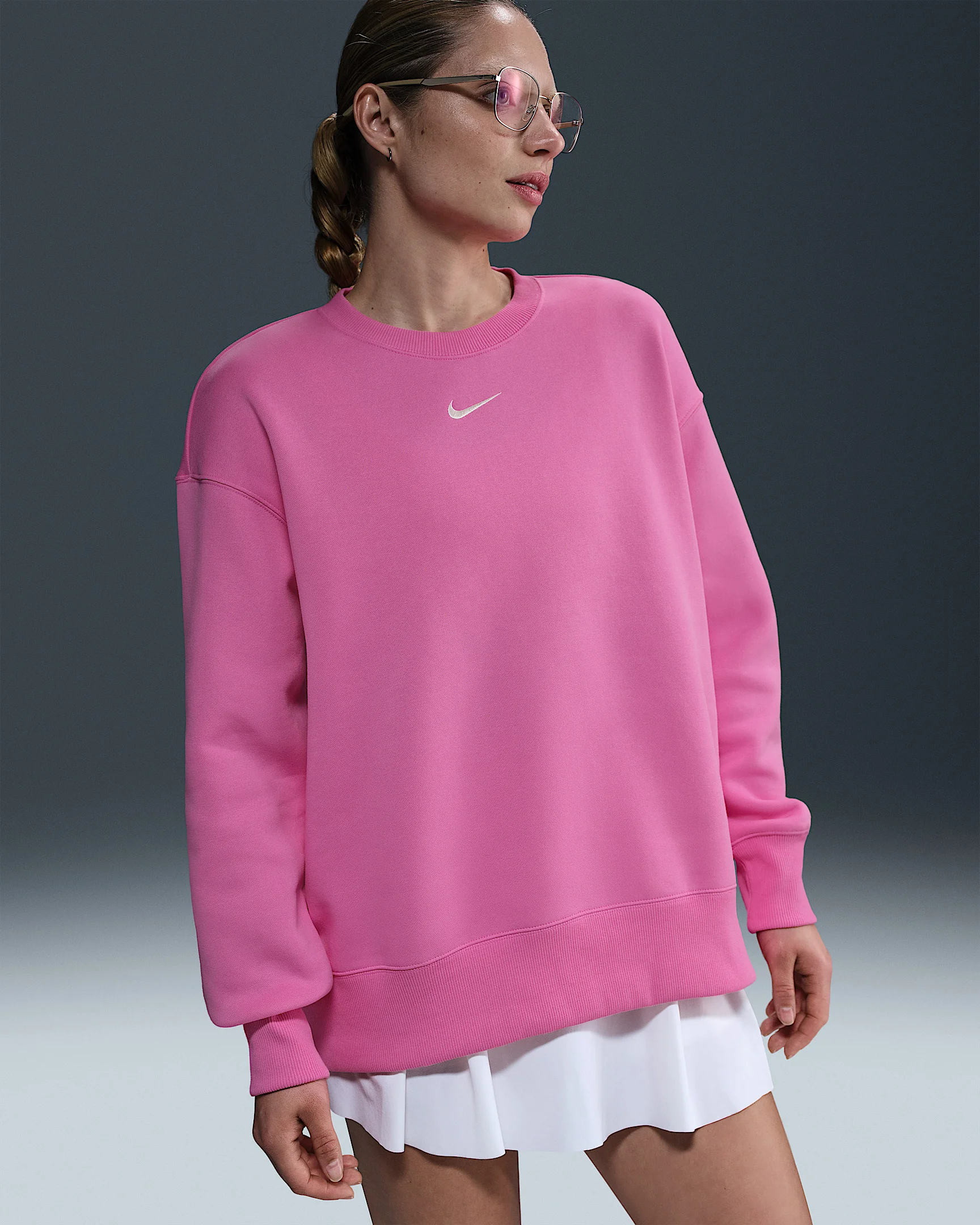 This cozy fleece sweatshirt feels extra soft on the inside and smooth on the outside. Dropped shoulders and extra-wide ribbing enhance the oversized look. Product Details - Body: 80% cotton/20% polyester. Rib: 97% cotton/3% spandex. - Embroidered Swoosh logo at center chest - Machine wash - Imported - Shown: Playful Pink/Sail - Style: FZ4270-675 SIZE & FIT Model is wearing size S and is 5′10″178cm Oversized fit: exaggerated and spacious