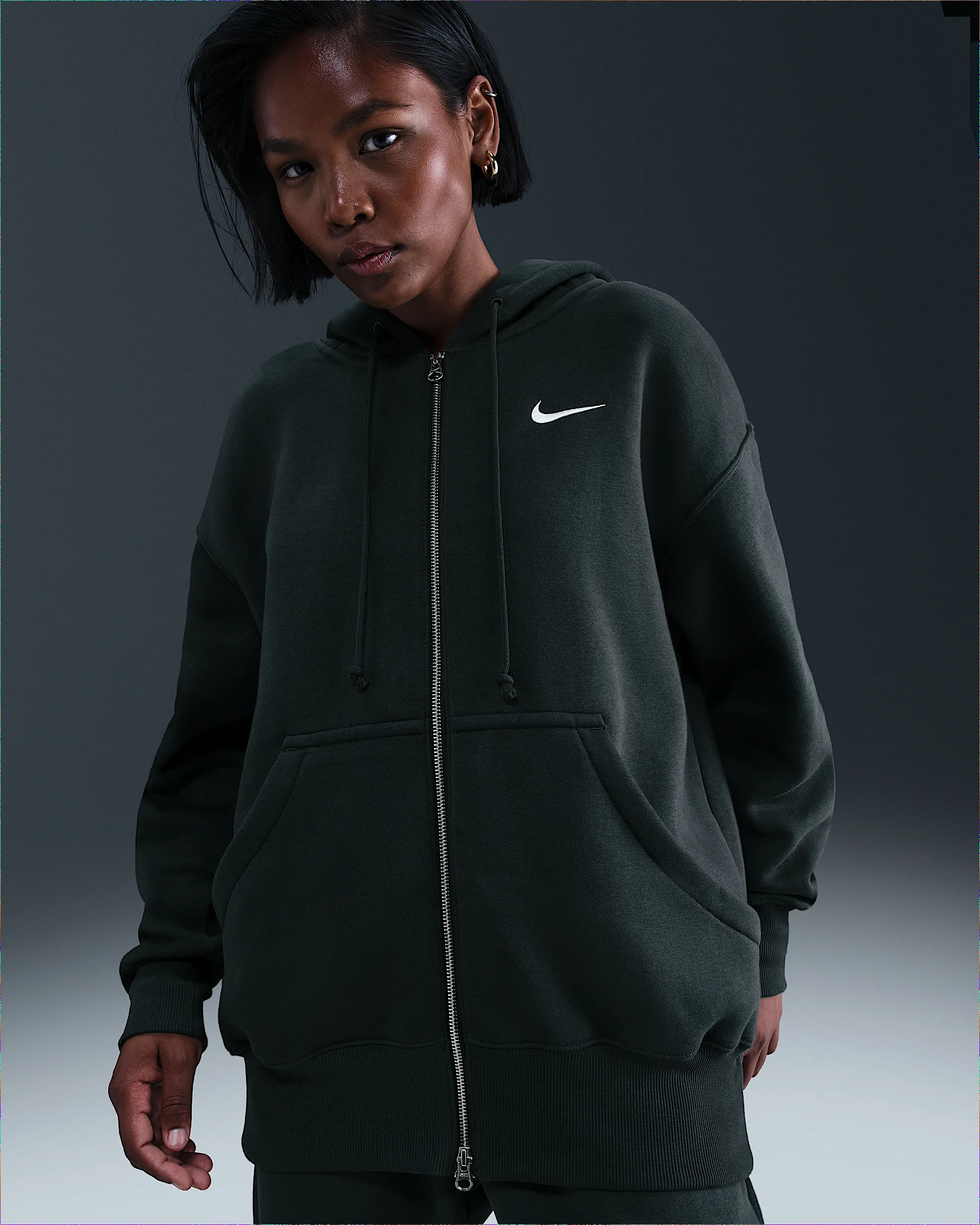 Grounded in style, comfort and versatility, meet our take on luxury loungewear. This zip-up hoodie helps you stay cozy all day long, thanks to midweight fleece that feels soft yet structured. Plus, exaggerated details (like the oversized pocket and taller ribbing) give you a trend-right look. Benefits - Our midweight brushed fleece feels extra soft on the inside and smooth on the outside, helping you stay cozy while keeping its structured shape. - Dropped shoulder seams and oversized fit provide a casual, relaxed look. Product Details - Full zipper - Drawcord hood - Elongated ribbing - Embroidered Swoosh logo - Body: 80% cotton/20% polyester. Hood lining: 100% cotton. - Machine wash - Imported - Shown: Seaweed/Sail - Style: DQ5758-391 SIZE & FIT Loose fit: roomy and relaxed Fits large; we recommend ordering a size down