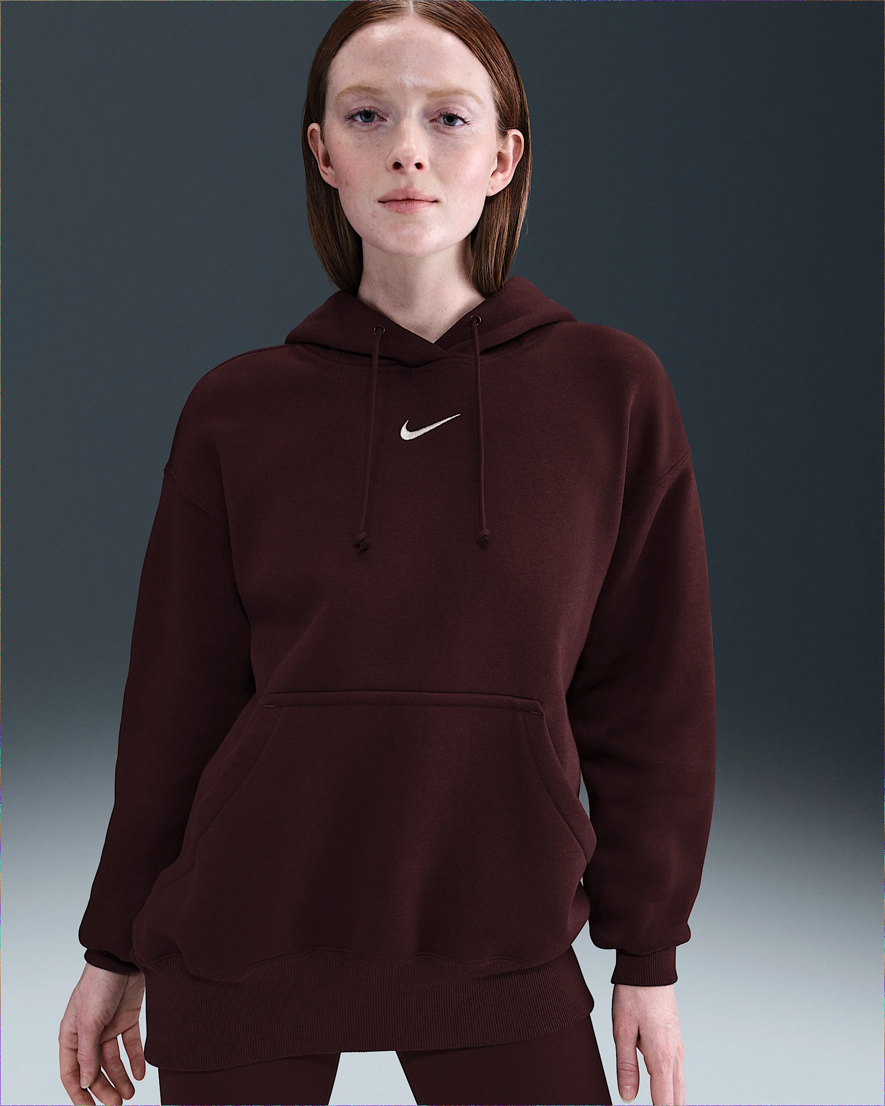 Grounded in style, comfort and versatility, meet our take on luxury loungewear. This classic hoodie helps you stay cozy all day long, thanks to midweight fleece that feels soft yet structured. Plus, exaggerated details (like taller ribbing and oversized fit) give you a trend-right look. Benefits - Our midweight brushed fleece feels extra soft on the inside and smooth on the outside, helping you stay cozy while keeping its structured shape. - Dropped shoulders and roomy sleeves provide a relaxed, oversized feel. Product Details - Drawcord hood - Elongated ribbing - Oversized pocket - Embroidered Swoosh logo - Body: 80% cotton/20% polyester. Hood lining: 100% cotton. - Machine wash - Imported - Shown: Burgundy Crush/Sail - Style: DQ5860-652 SIZE & FIT Model is wearing size S and is 5′7″170cm Oversized fit: exaggerated and spacious Fits large; we recommend ordering a size down