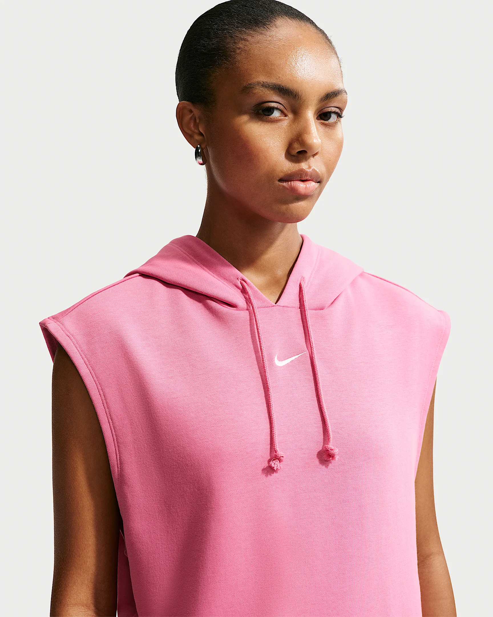 This sleeveless hoodie is crafted with midweight French terry fleece has soft loops on the inside and a light, drapey feel. It has a relaxed fit and elastic at the hem for a clean finish. Product Details - Embroidered Swoosh logo - Hood with drawcord - Body: 80% cotton/20% polyester. Hood lining: 100% cotton. - Machine wash - Imported - Shown: Peony/Sail - Style: IR1717-641 SIZE & FIT Model is wearing size S and is 5′9″175cm Standard fit: easy and traditional