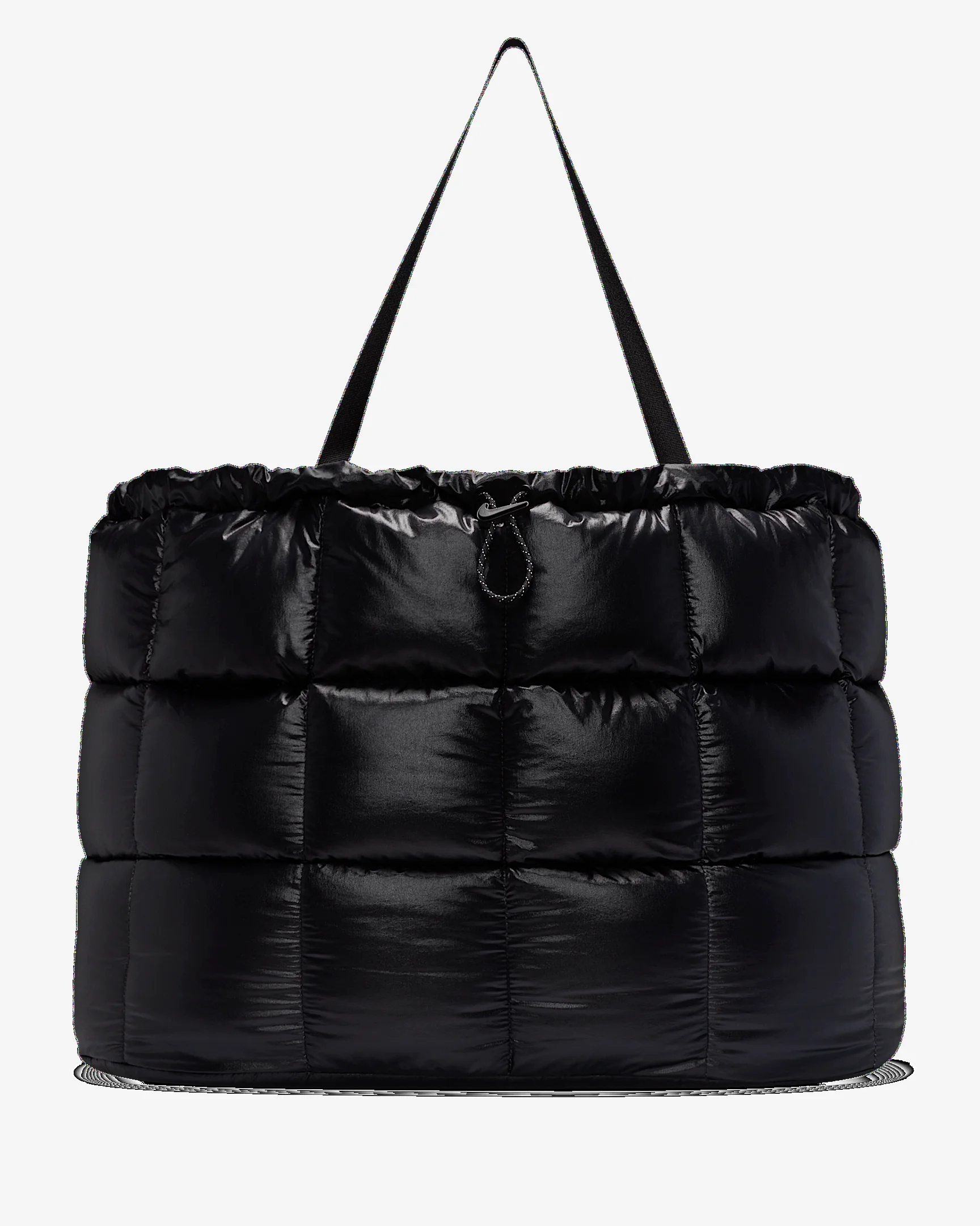Carry your stuff in style. This bag features luxe materials and a puffer design. The large, main compartment has a cinch closure with Swoosh logo cord lock to secure your belongings. Zippered interior pockets help you stay organized. Product Details - 29"W x 17"H x 14"D - Body: 100% nylon. Lining: 100% polyester. - Spot clean - Imported - Shown: Black/Black/Iron Grey - Style: IQ7682-010