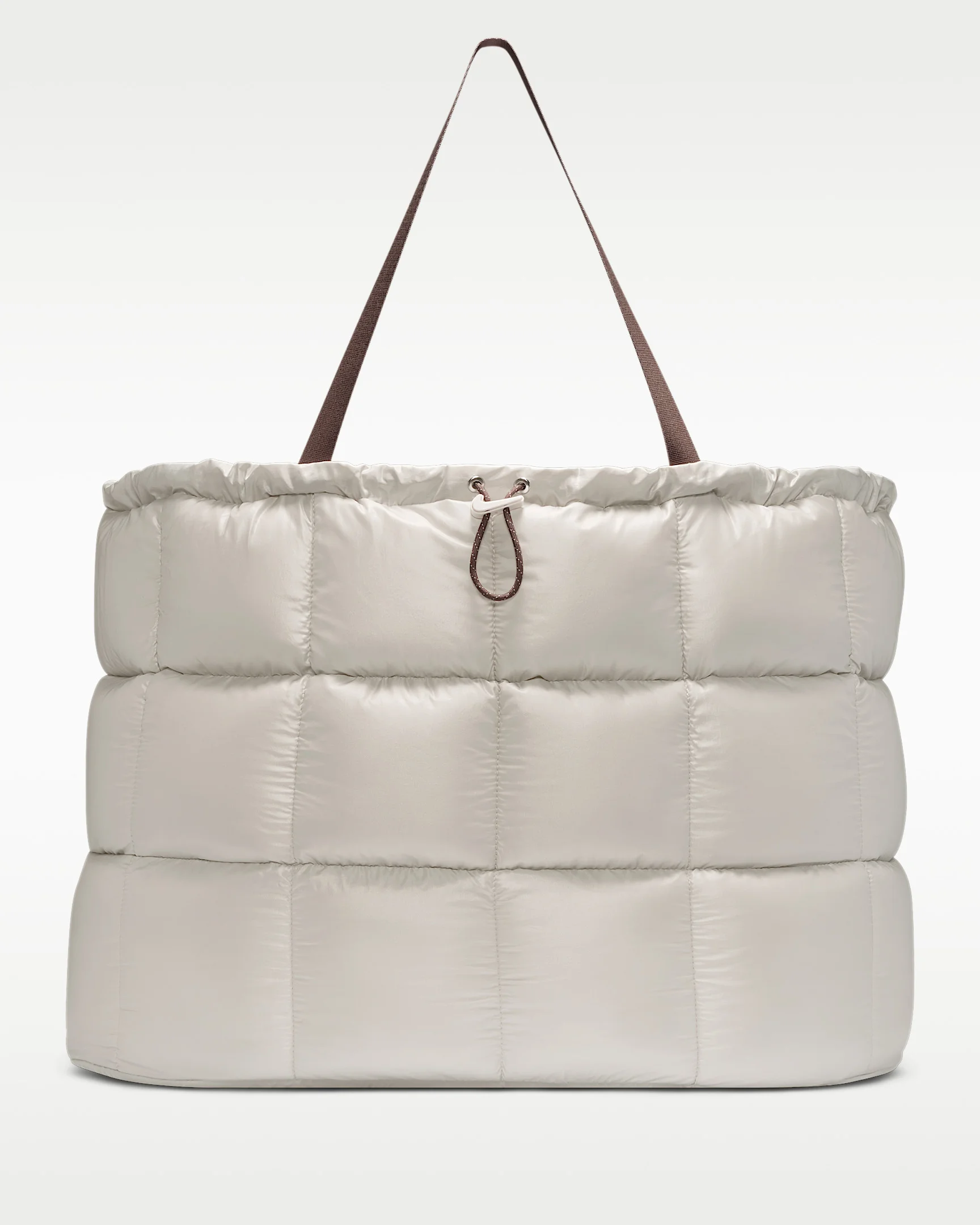 Carry your stuff in style. This bag features luxe materials and a puffer design. The large, main compartment has a cinch closure with Swoosh logo cord lock to secure your belongings. Zippered interior pockets help you stay organized. Product Details - 29"W x 17"H x 14"D - Body: 100% nylon. Lining: 100% polyester. - Spot clean - Imported - Shown: Light Bone/Mink Brown/Sail - Style: IQ7682-072