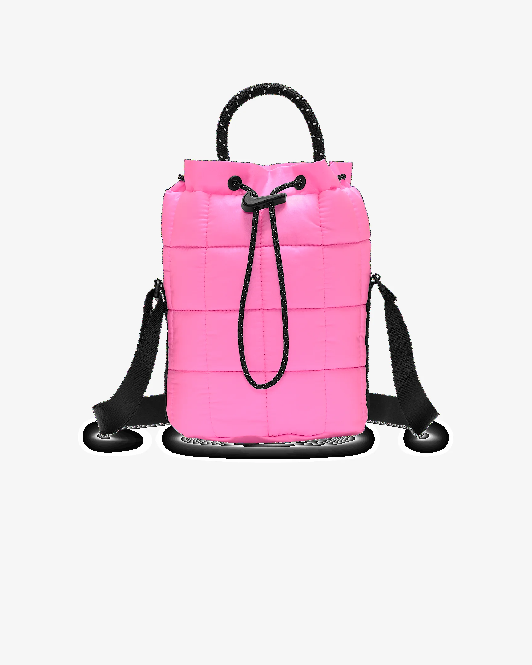 Small in size, big in style. This tiny tote features luxe materials and a puffer design. The main compartment has a cinch closure with Swoosh logo cord lock to secure your belongings. An adjustable crossbody strap is paired with a handle for multiple ways to carry. Product Details - 6"W x 8"H x 6"D - Body: 100% nylon. Lining: 100% polyester. - Spot clean - Imported - Shown: Pink Spell/Black/Black - Style: HQ6709-606