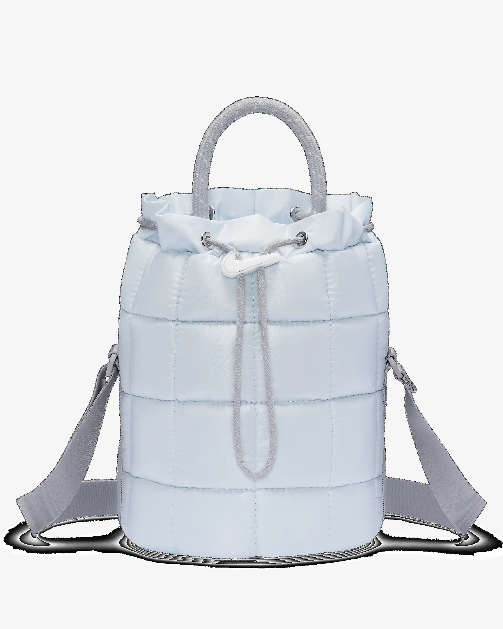 Small in size, big in style. This tiny tote features luxe materials and a puffer design. The main compartment has a cinch closure with Swoosh logo cord lock to secure your belongings. An adjustable crossbody strap is paired with a handle for multiple ways to carry. Product Details - 6"W x 8"H x 6"D - Body: 100% nylon. Lining: 100% polyester. - Spot clean - Imported - Shown: Pure Platinum/Wolf Grey/Summit White - Style: HQ6709-043