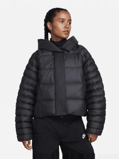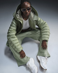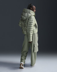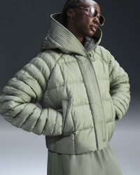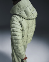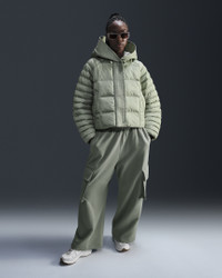 Stay warm on the coldest days by bundling up in this oversized puffer. Nike Therma-FIT technology helps manage your body’s natural heat to help keep you warm in cold-weather conditions. Exaggerated details (like the extra-wide storm flap and the oversized hood) help give this winter staple an updated look, while the PrimaLoft® Thermoplume®-filled baffles work to keep you cozy. And when your hands get cold, just slip them in the pockets—or zip them up to keep small items safe. More Benefits - Style: Warm, hip-length jacket with oversized fit - Materials: Nylon fabric and PrimaLoft® - Construction: Synthetic insulation, iconic square baffles and embossed lining - Storage: Zippered hand pockets - Trim: Snap closures, and bungee toggles at hem and hood - Perks: Oversized hood features storm flap Product Details - Body: 58% polyester/42% nylon. Lining: 100% polyester. Fill: 100% polyester. - Applique Swoosh logo at center back - Embroidered Swoosh logo at hood - Machine wash - Imported - Shown: Jade Horizon/Sail - Style: FB8729-370 SIZE & FIT Model is wearing size S and is 5′9″175cm Loose fit: roomy and relaxed