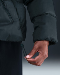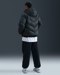Get cozy in this puffer jacket. Storm-FIT technology helps keep you comfortable in harsh weather conditions. Down-filled baffles add both dimension and insulation and bungees at the hem and hood help you cinch out the cold. More Benefits - Style: Warm puffer with loose fit - Materials: Polyester fabric and down fill - Construction: Iconic Windrunner chevron baffles - Storage: Zippered hand pockets and interior pocket - Trim: Zipper closure and elongated bungee toggles at the hood Product Details - Body/Lining: 100% polyester. Fill: White/Grey Duck Down (Minimum 85% down)/(APA Version: 85% white/grey duck down/15% feathers). - Embroidered Swoosh logo - Embroidered Storm-FIT logo - Machine wash - Imported - Shown: Seaweed/Sail - Style: IF2591-390 SIZE & FIT Model is wearing size S and is 5′11″179cm Loose fit: roomy and relaxed