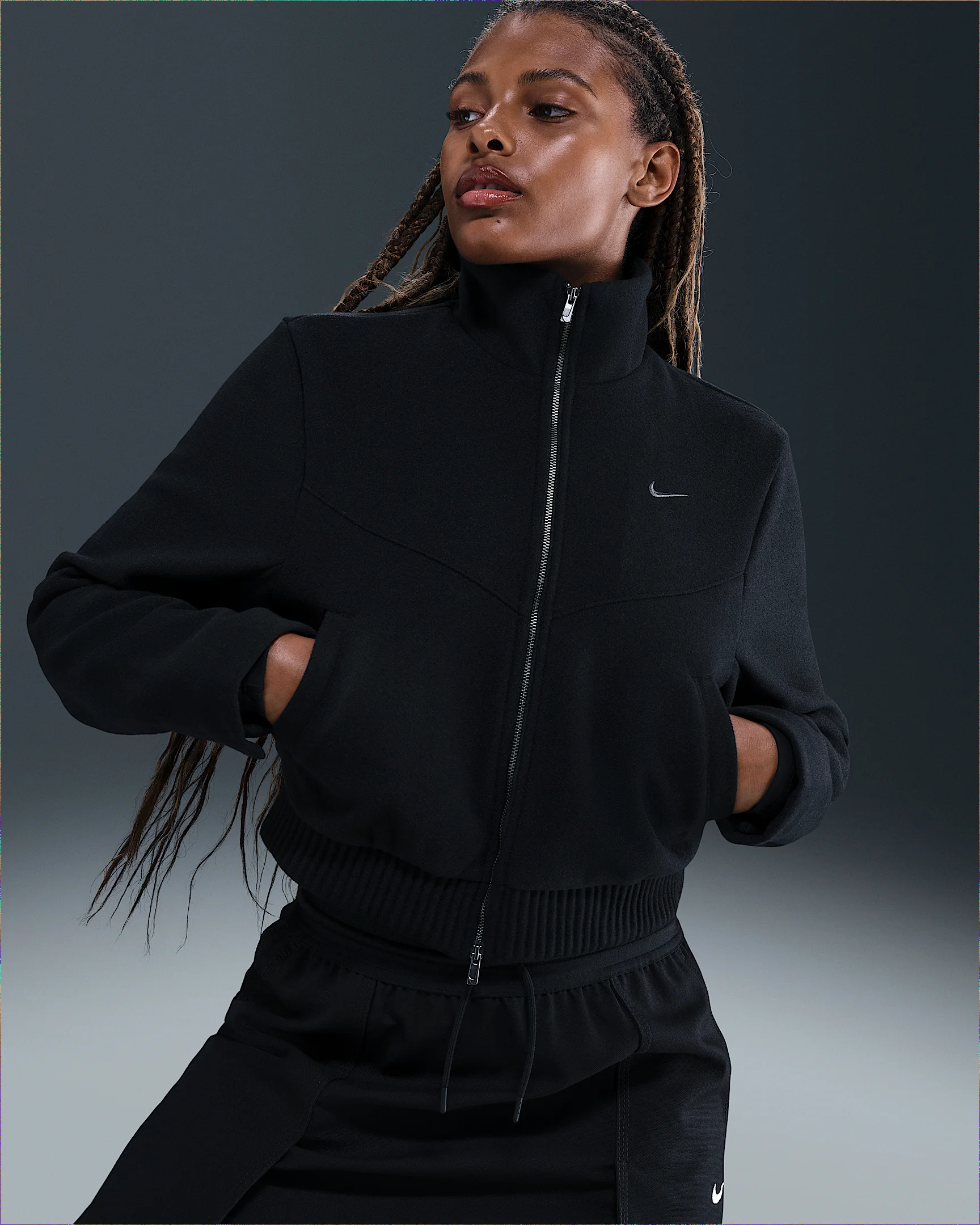 Elevating sport inspiration, this jacket is made from structured French Terry and has a satin lining for a luxe feel. Benefits - 26-degree chevron line connects to Nike history. - Hidden zippers on the pockets give you a more secure way to store your small items. Product Details - 100% polyester - Hidden snap at sleeve - 2-way zipper - Elastic hem - Embroidered Swoosh logo - Woven jock tag - Machine wash - Imported - Shown: Black/Anthracite - Style: HV5143-010 SIZE & FIT Model is wearing size S and is 5′11″179cm Loose fit: roomy and relaxed