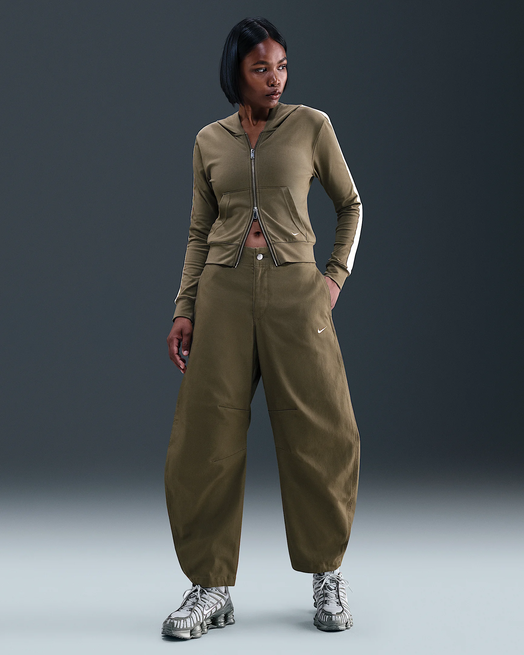 Defined by volume, these pants add dimension to every step. Heavyweight cotton and darts at the knees give you a structured look. Product Details - 100% cotton - Pockets - Loose fit - Embroidered Swoosh logo - Elastic at back of waistband - Machine wash - Imported - Shown: Medium Olive/Sail - Style: HV2086-222 SIZE & FIT Model is wearing size S and is 5′7″170cm Loose fit: roomy and relaxed 78 length: hits at ankle