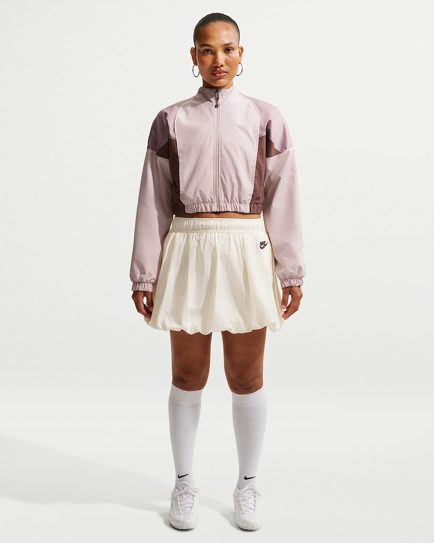 Sport-inspired style gets reinvented. A bubble hem gives this roomy taffeta skirt a billowy look for modern street style Benefits - Water-repellent finish helps keep you dry in wet weather. - Lightweight woven lining is smooth and comfortable. Product Details - Embroidered logo - Hand pockets - Elastic waistband with drawcord - Lightweight lining - Body: 100% nylon. Lining: 100% polyester. - Machine wash - Imported - Shown: Sail/Black/Black - Style: IQ0061-133 SIZE & FIT Model is wearing size S and is 5′8″171cm Loose fit: roomy and relaxed