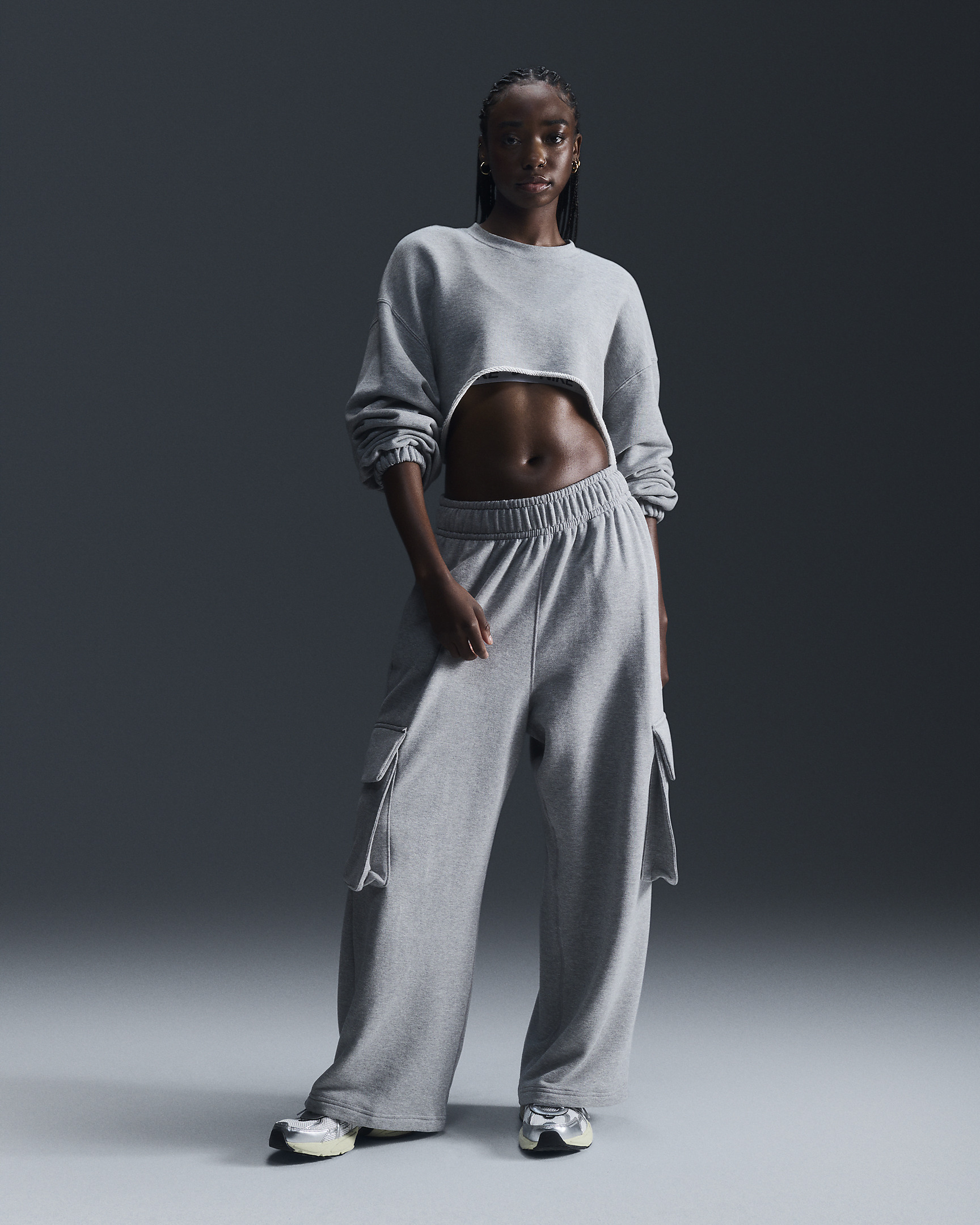 Show up and show out in these overstated cargos. The oversized fit and pockets help accentuate your moves while bringing a laid-back look. French terry fabric is heavy enough to drape but feels light enough to run it again. Benefits - Unbrushed French terry fabric gives you structure while still being breathable. - Elastic waistband with extended drawcord lets you dial in your perfect fit. Product Details - 100% cotton - Side-seam hand pockets - Embroidered Swoosh logo - Machine wash - Imported - Shown: Dark Grey Heather/Black - Style: FV7512-063 SIZE & FIT Oversized fit: exaggerated and spacious Fl length: hits below ankle