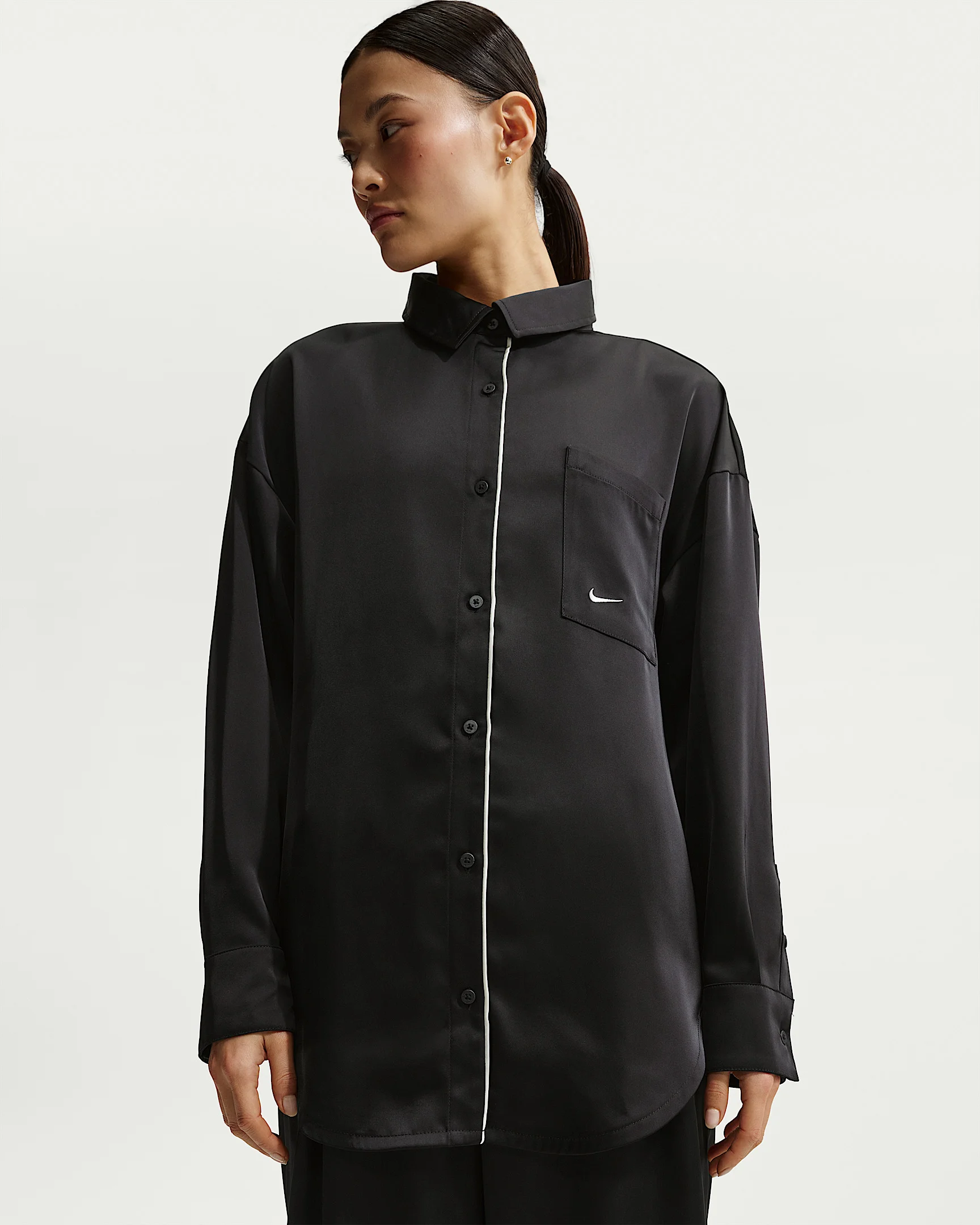Designed to fit loose and long, this button-up top is made with satin fabric for a luxurious feel. Piping detail adds a touch of sport style to this polished look. Product Details - Chest pocket with embroidered logo - Curved hem - 100% polyester - Machine wash - Imported - Shown: Black/Sail - Style: IM0575-010 SIZE & FIT Model is wearing size S and is 5'7"170cm Oversized fit: exaggerated and spacious