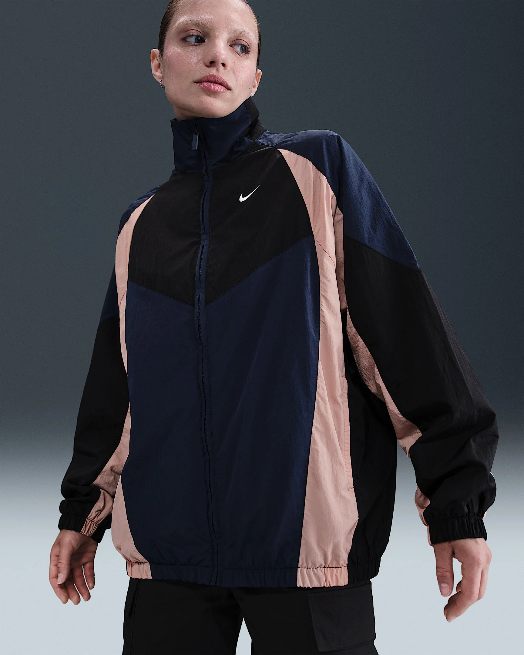 Made with lightweight taffeta, this oversized jacket has a crisp texture. A UV-resistant and water-repellent finish help keep you ready for the day come rain or shine. Benefits - Water-repellent finish helps keep you dry in wet weather. - Mesh lining moves sweat away from your skin for quick evaporation, helping you stay dry and comfortable. Product Details - Body/insets lining: 100% nylon. Lining: 100% polyester. - This product provides UVA and UVB protection from the sun only in the areas covered by the garment. To protect exposed areas, the use of good quality sunscreen is recommended. - Full-length zipper with branded zipper pull - Structured collar - Pockets - Embroidered Swoosh logo on left chest - Machine wash - Imported - Shown: Midnight Navy/Black/Particle Pink/Sail - Style: HV4029-410 SIZE & FIT Oversized fit: exaggerated and spacious