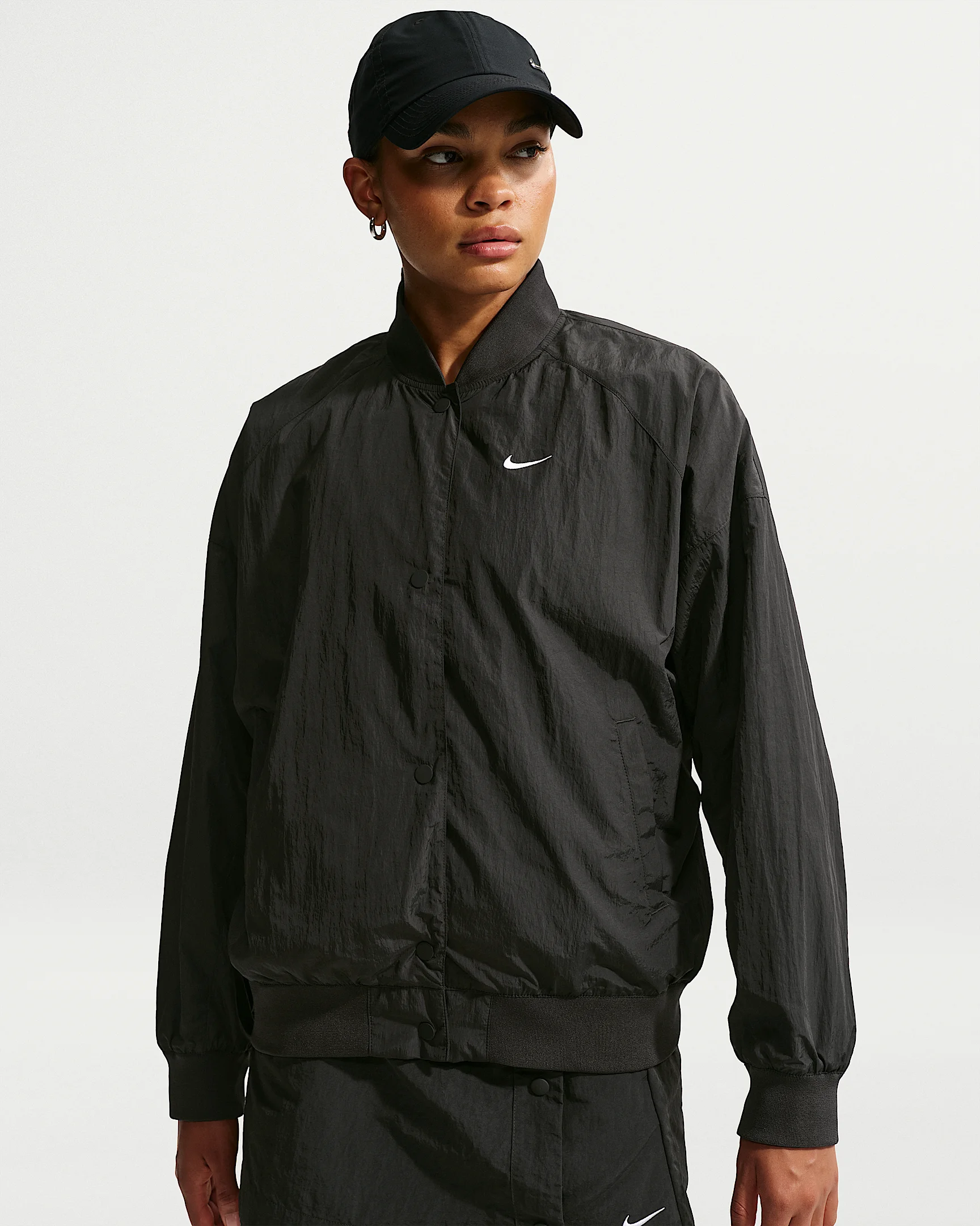 This take on a varsity jacket has an extra roomy fit, dropped shoulders and voluminous sleeves for modern drape. It's made with a UV protectant and water-repellent taffeta jacket to help with coverage against light rain and shine. Product Details - Embroidered logo - Snap front closure - Hands pockets - Body: 100% nylon. Rib: 99% polyester/1% spandex. Lining: 100% polyester. - Machine wash - Imported - Shown: Black/Black/Black/White - Style: IF0332-010 SIZE & FIT Model is wearing size S and is 5′11″179cm Oversized fit: exaggerated and spacious
