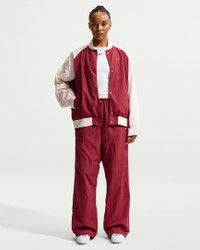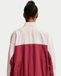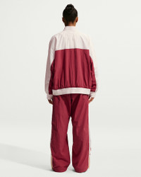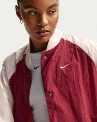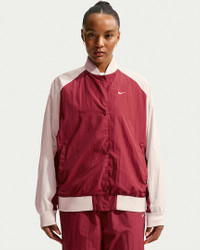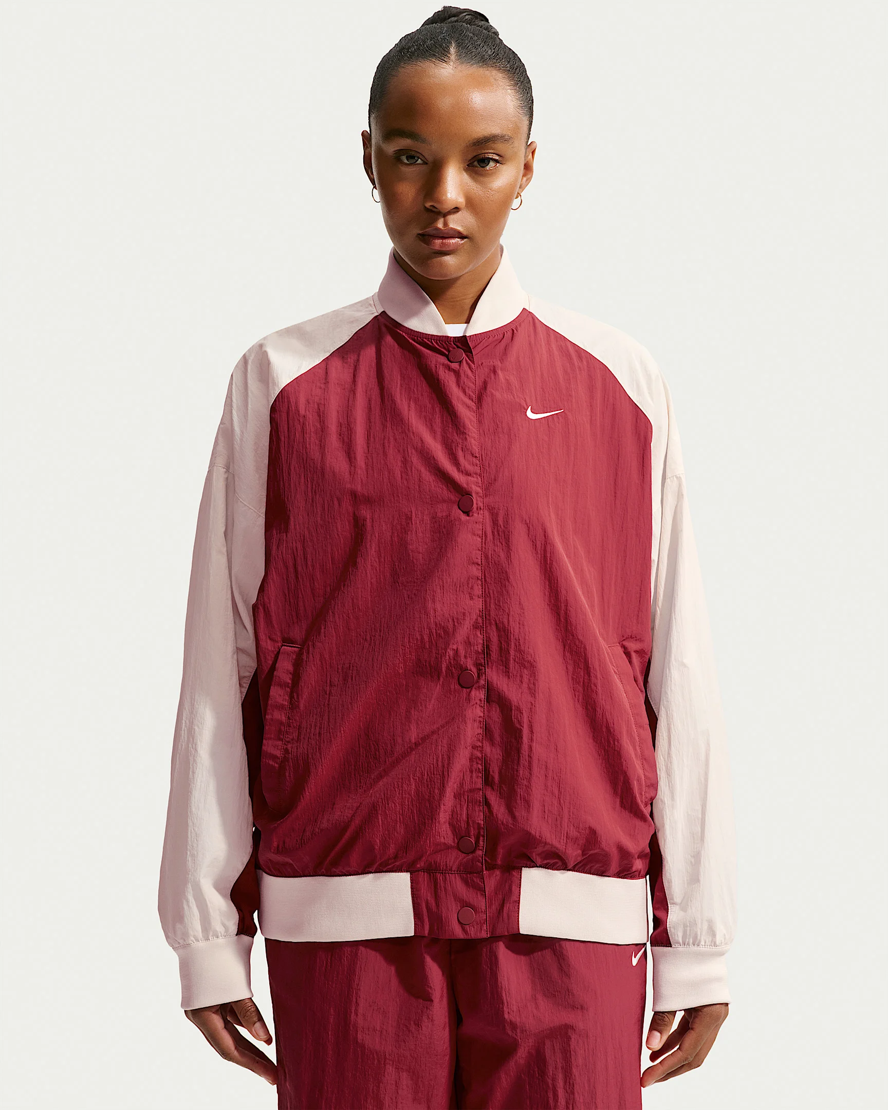 This take on a varsity jacket has an extra roomy fit, dropped shoulders and voluminous sleeves for modern drape. It's made with a UV protectant and water-repellent taffeta jacket to help with coverage against light rain and shine. Product Details - Embroidered logo - Snap front closure - Hands pockets - Body: 100% nylon. Rib: 99% polyester/1% spandex. Lining: 100% polyester. - Machine wash - Imported - Shown: Team Crimson/Chalk/Chalk/Chalk - Style: IF0332-613 SIZE & FIT Oversized fit: exaggerated and spacious