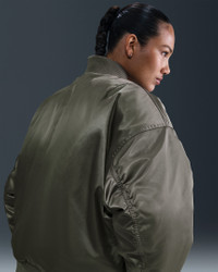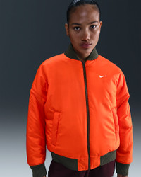 Switch things up in this roomy, reversible jacket. One side has luxe, water-repellent sateen fabric while the other has a cool matte taffeta. Classic bomber jacket details—like thick ribbing at the cuffs and hem, secure hand pockets and a metallic zipper—tie both sides together. More Benefits - Style: Warm, hip-length jacket with loose fit and high-low hem - Materials: Smooth, water-repellent sateen on one side and matte taffeta on the other - Construction: Lightweight synthetic insulation - Storage: Snap closure hand pockets on both sides and a zippered arm pocket - Trim: Zippered closure - Perks: Reversible design Product Details - Body: 100% polyester. Rib: 97% polyester/3% spandex. Fill: 100% polyester - Embroidered Swoosh logo - Hanger loop - Machine wash - Imported - Shown: Medium Olive/Safety Orange/Sail/Sail - Style: HV2812-222 SIZE & FIT Model is wearing size S and is 5′8″171cm Oversized fit: exaggerated and spacious