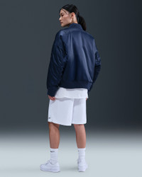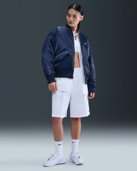 Switch things up in this roomy, reversible jacket. One side has luxe, water-repellent sateen fabric while the other has a cool matte taffeta. Classic bomber jacket details—like thick ribbing at the cuffs and hem, secure hand pockets and a metallic zipper—tie both sides together. More Benefits - Style: Warm, hip-length jacket with loose fit and high-low hem - Materials: Smooth, water-repellent sateen on one side and matte taffeta on the other - Construction: Lightweight synthetic insulation - Storage: Snap closure hand pockets on both sides and a zippered arm pocket - Trim: Zippered closure - Perks: Reversible design Product Details - Body: 100% polyester. Rib: 97% polyester/3% spandex. Fill: 100% polyester - Embroidered Swoosh logo - Hanger loop - Machine wash - Imported - Shown: Midnight Navy/Diffused Blue/Sail/Sail - Style: HV2812-410 SIZE & FIT Model is wearing size S and is 5′7″170cm Oversized fit: exaggerated and spacious