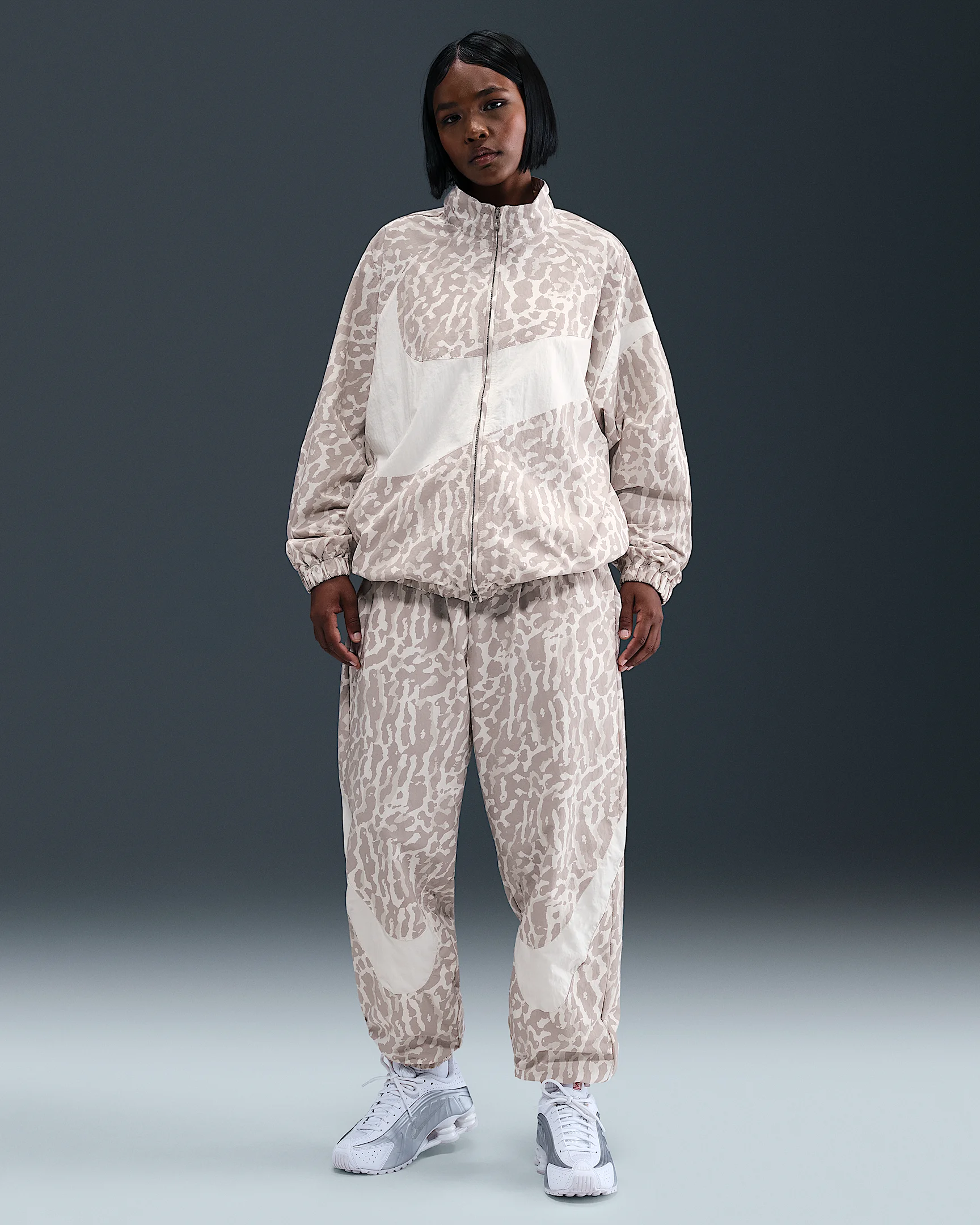 Smooth nylon and an oversized fit give these mid-rise joggers a bold and athletic look. An elastic waistband with drawcord helps you dial in your perfect fit. Benefits - Water-repellent finish helps keep you comfortable in light rain. - Lightweight fabric moves sweat away from your skin for quick evaporation, helping you stay dry and comfortable. Product Details - Body: 100% nylon. Lining: 100% polyester. - Elastic waistband with drawcord - Pockets - Embroidered Swoosh logo - Machine wash - Imported - Shown: College Grey/Sail - Style: IB7266-009 SIZE & FIT Model is wearing size S and is 5′7″170cm Oversized fit: exaggerated and spacious Fl length: hits below ankle
