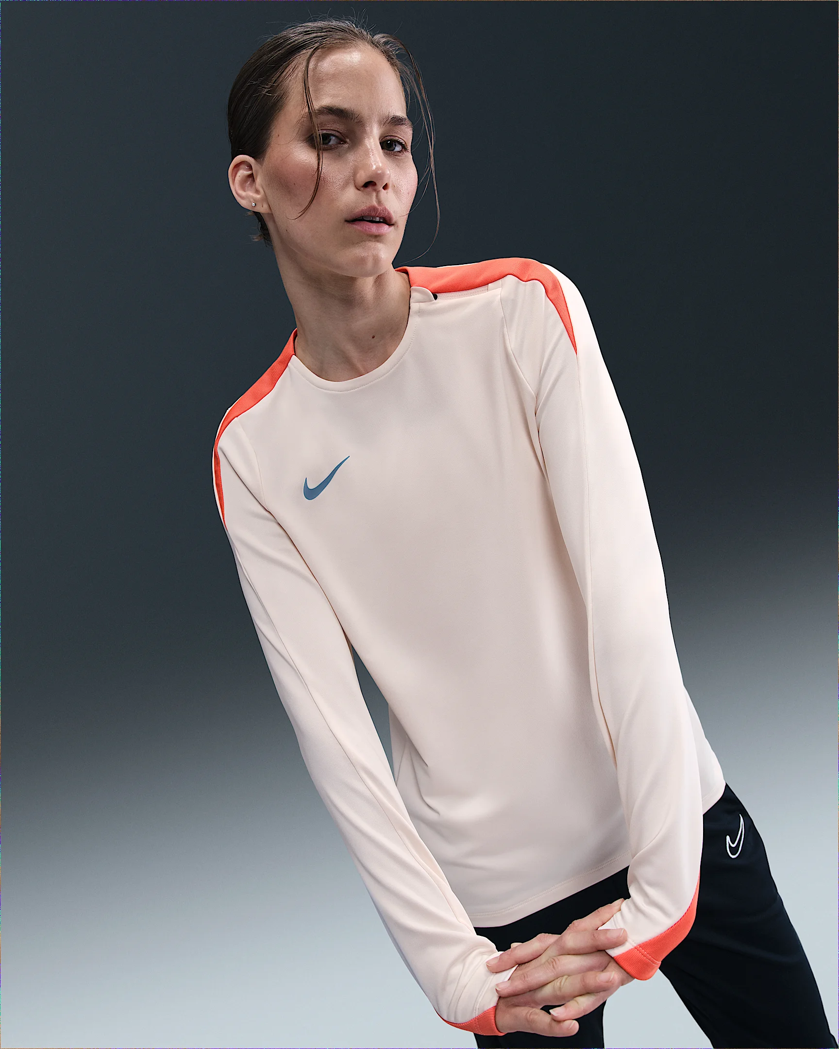 With design details specifically tailored for soccer's rising stars, this easy-fitting top has the perfect amount of stretch to help you feel free on the field. Sweat-wicking tech helps keep you cool and focused while you fine-tune your skills. Benefits - Nike Dri-FIT technology moves sweat away from your skin for quicker evaporation, helping you stay dry and comfortable. - Thumbholes let you extend your coverage and help hold the sleeves in place while you move. - Zipper on left shoulder makes for easy changing. Product Details - Body: 91% polyester/9% spandex. Panels: 100% polyester. - Machine wash - Imported - Shown: Chalk/Turf Orange/Smokey Blue - Style: FN5012-102 SIZE & FIT Model is wearing size S and is 5′10″178cm Standard fit: easy and traditional