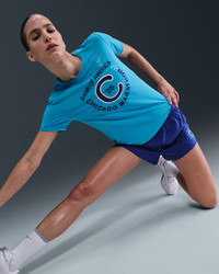 Rep the Bank of America Chicago Marathon in this lightweight top. It's soft and sweat-wicking so you can focus on your pace. Benefits - Modified raglan sleeves are designed to help reduce underarm chafing and allow for a wider range of motion. - Nike Dri-FIT technology moves sweat away from your skin for quicker evaporation, helping you stay dry and comfortable. - Large mesh panel on the back helps moisture escape. - Tapered fit around the waist makes layering with other pieces is easier. - Curved hem helps keep you covered through your stride. Product Details - Reflective details on front and back - Body: 88% polyester/12% spandex, Mesh: 100% polyester. - Machine wash - Imported - Not intended for use as Personal Protective Equipment (PPE) - Shown: Light Current Blue - Style: HQ4314-440 SIZE & FIT Model is wearing size S and is 5′10″178cm Standard fit: easy and traditional
