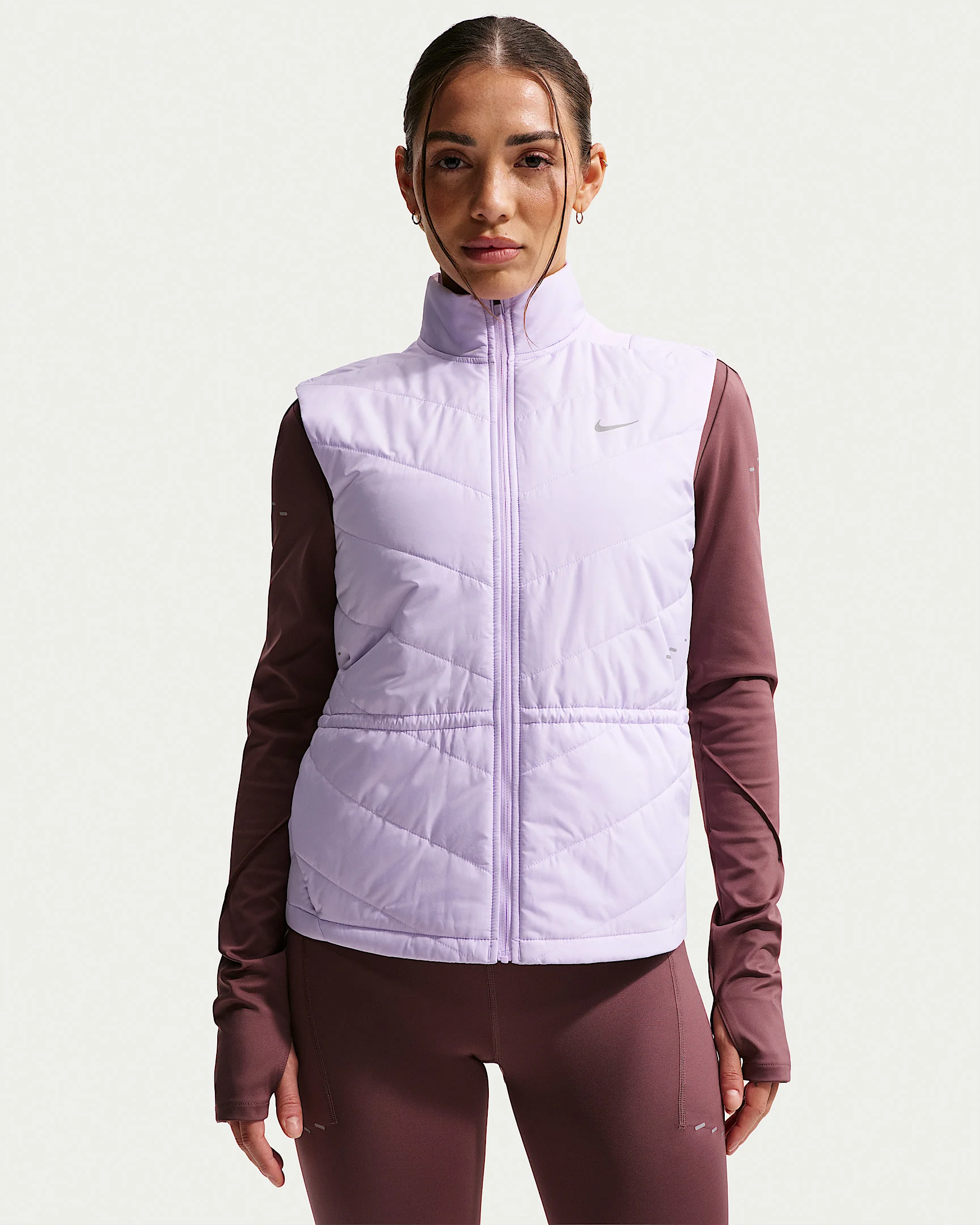 Don't let chilly temps stop you from running. A smooth, water-repellent shell teams up with synthetic insulation and a heat-regulating back panel to give you lightweight warmth in a made-to-move design. Benefits - Nike Therma-FIT technology helps manage your body’s natural heat to help keep you warm in cold-weather conditions. - Synthetic fill helps keep you insulated and warm. - Drawcord at the waist lets you cinch in the vest for a more tailored fit. - Brushed knit back panel offers the stretch you need for easy movement. - Zippered side pockets offer secure storage for small essentials. Product Details - Body/Lining/Fill/Back of panels fabric: 100% polyester. Face of panels fabric: 82% polyester/18% spandex. - Reflective details - Whistle at collar - Not intended for use as Personal Protective Equipment (PPE) - Machine wash - Imported - Shown: Violet Mist - Style: HV2655-511 SIZE & FIT Model is wearing size S and is 5′6″168cm Standard fit: easy and traditional