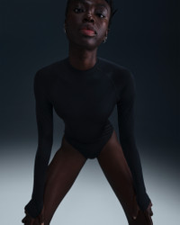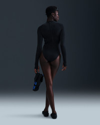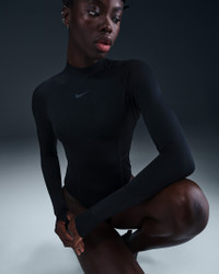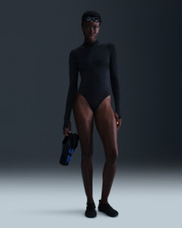 Get ready for our most locked-in fit. Nike HydraLock material is saltwater- and chlorine-resistant while also getting top marks for its quick-dry and compressive fabric. Long sleeves give you the kind of coverage you need to spend all day reaching for your goals. Benefits - Nike HydraLock fabric provides a locked-in feel and streamlined fit that minimizes distractions so you can swim freely and with confidence. - Perforated removable cups dry quickly and allow you to customize your coverage. - Thumbholes help keep the sleeves in place as you move. - Silicone elastic underbust gripper provides a stay-put fit. - Ergonomic, flatlock seams help reduce chafing. Product Details - Back zipper with zipper garage - Heat Transfer Swoosh logo - Body: 69% polyester/31% spandex (chlorine-resistant). Lining: 100% polyester. - Hand wash cold separately after each wearing. Non-chlorine bleach. Line dry. Do not iron. Do not dry clean. Do not store wet. - Imported - Shown: Black - Style: NESSF166-001
