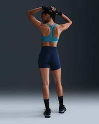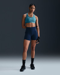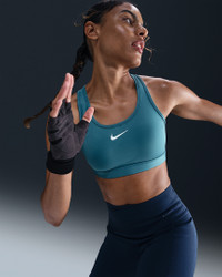 You're on the move. Your padding shouldn't be. This Swoosh bra's sewn-in pads stay in place so you can work hard without worrying about them shifting or folding. Great for training workouts and dance classes, medium support gives you a snug hold that helps keep everything in place. Plus, sweat-wicking, adaptive material quickly recovers its shape so you can stay comfortable throughout your workout. Product Details - Body: 72% polyester/28% spandex. Mesh: 81% polyester/19% spandex. Back lining: 72% polyester/28% spandex. Pad back fabric: 100% polyester. Pad: 100% polyurethane. - Machine wash - Imported - Shown: Smokey Blue/White - Style: DX6821-006 SIZE & FIT Model is wearing size S Model height: 5′10″178cm Model bust: 31″79cm Tight fit: snug and form-fitting Medium support: feels ke a snug hold to keep everything in place