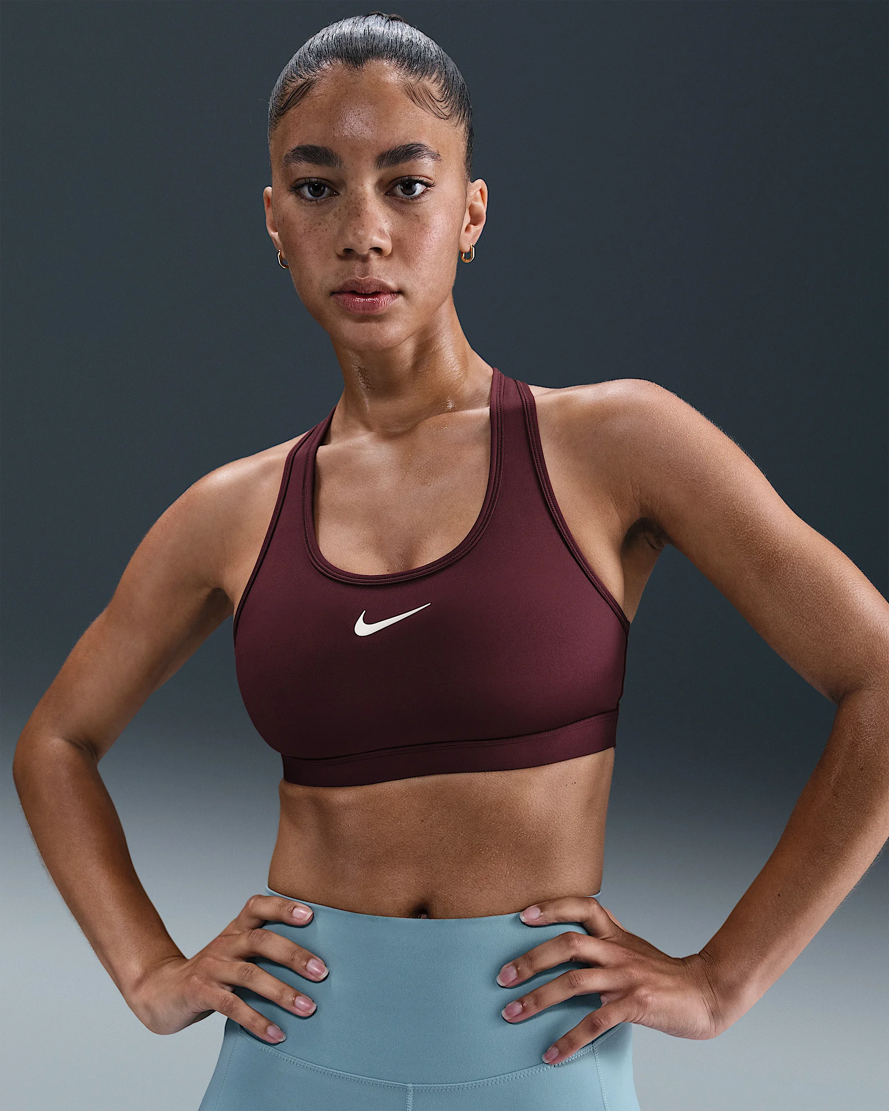 You're on the move. Your padding shouldn't be. This Swoosh bra's sewn-in pads stay in place so you can work hard without worrying about them shifting or folding. Great for training workouts and dance classes, medium support gives you a snug hold that helps keep everything in place. Plus, sweat-wicking, adaptive material quickly recovers its shape so you can stay comfortable throughout your workout. Product Details - Body: 72% polyester/28% spandex. Mesh: 81% polyester/19% spandex. Back lining: 72% polyester/28% spandex. Pad back fabric: 100% polyester. Pad: 100% polyurethane. - Machine wash - Imported - Shown: Burgundy Crush/White - Style: DX6821-652 SIZE & FIT Model is wearing size S Model height: 5′9″175cm Model bust: 34″86cm Tight fit: snug and form-fitting Medium support: feels ke a snug hold to keep everything in place