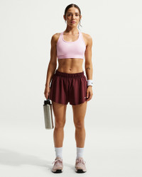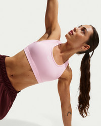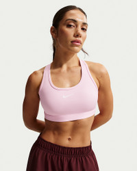You're on the move. Your padding shouldn't be. This Swoosh bra's sewn-in pads stay in place so you can work hard without worrying about them shifting or folding. Great for training workouts and dance classes, medium support gives you a snug hold that helps keep everything in place. Plus, sweat-wicking, adaptive material quickly recovers its shape so you can stay comfortable throughout your workout. Product Details - Body: 72% polyester/28% spandex. Mesh: 81% polyester/19% spandex. Back lining: 72% polyester/28% spandex. Pad back fabric: 100% polyester. Pad: 100% polyurethane. - Machine wash - Imported - Shown: Pink Foam/Stone Mauve/White - Style: DX6821-663 SIZE & FIT Model is wearing size S Model height: 5′6″168cm Model bust: 32″81cm Tight fit: snug and form-fitting Medium support: feels ke a snug hold to keep everything in place
