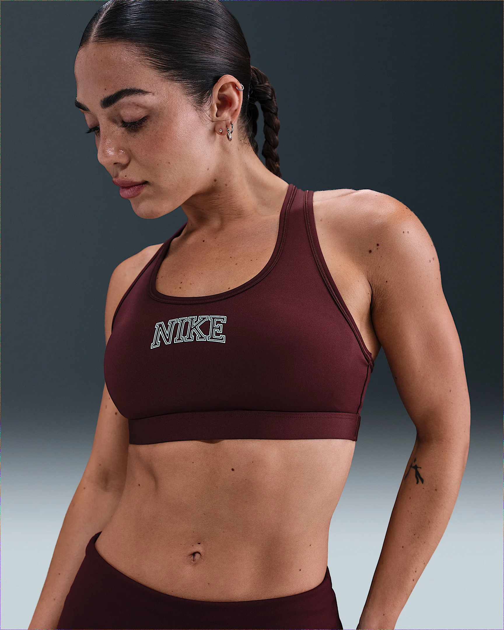 Train hard with everything in place. This sweat-ready bra gives you support with a snug hold and stay-put coverage. Its stretchy material wicks moisture and recovers its shape wear after wear, so it's ready to go again whenever you are. Product Details - Sewn-in pads - Racerback - Body/Back lining: 72% polyester/28% spandex. Mesh: 81% polyester/19% spandex. Pad back fabric: 100% polyester. Pad: 100% polyurethane. - Machine wash - Imported - Shown: Burgundy Crush - Style: IM7504-652 SIZE & FIT Model is wearing size S Model height: 5′6″168cm Model bust: 32″81cm Tight fit: snug and form-fitting Medium support: feels ke a snug hold to keep everything in place