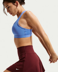 You're on the move. Your padding shouldn't be. This Swoosh bra's sewn-in pads stay in place so you can work hard without worrying about them shifting or folding. Great for training workouts and dance classes, medium support gives you a snug hold that helps keep everything in place. Plus, sweat-wicking, adaptive material quickly recovers its shape so you can stay comfortable throughout your workout. Product Details - Body: 72% polyester/28% spandex. Mesh: 81% polyester/19% spandex. Back lining: 72% polyester/28% spandex. Pad back fabric: 100% polyester. Pad: 100% polyurethane. - Machine wash - Imported - Shown: Sapphire/White - Style: DX6821-570 SIZE & FIT Model is wearing size S Model height: 5'9"174cm Model bust: 33"84cm Tight fit: snug and form-fitting Medium support: feels ke a snug hold to keep everything in place