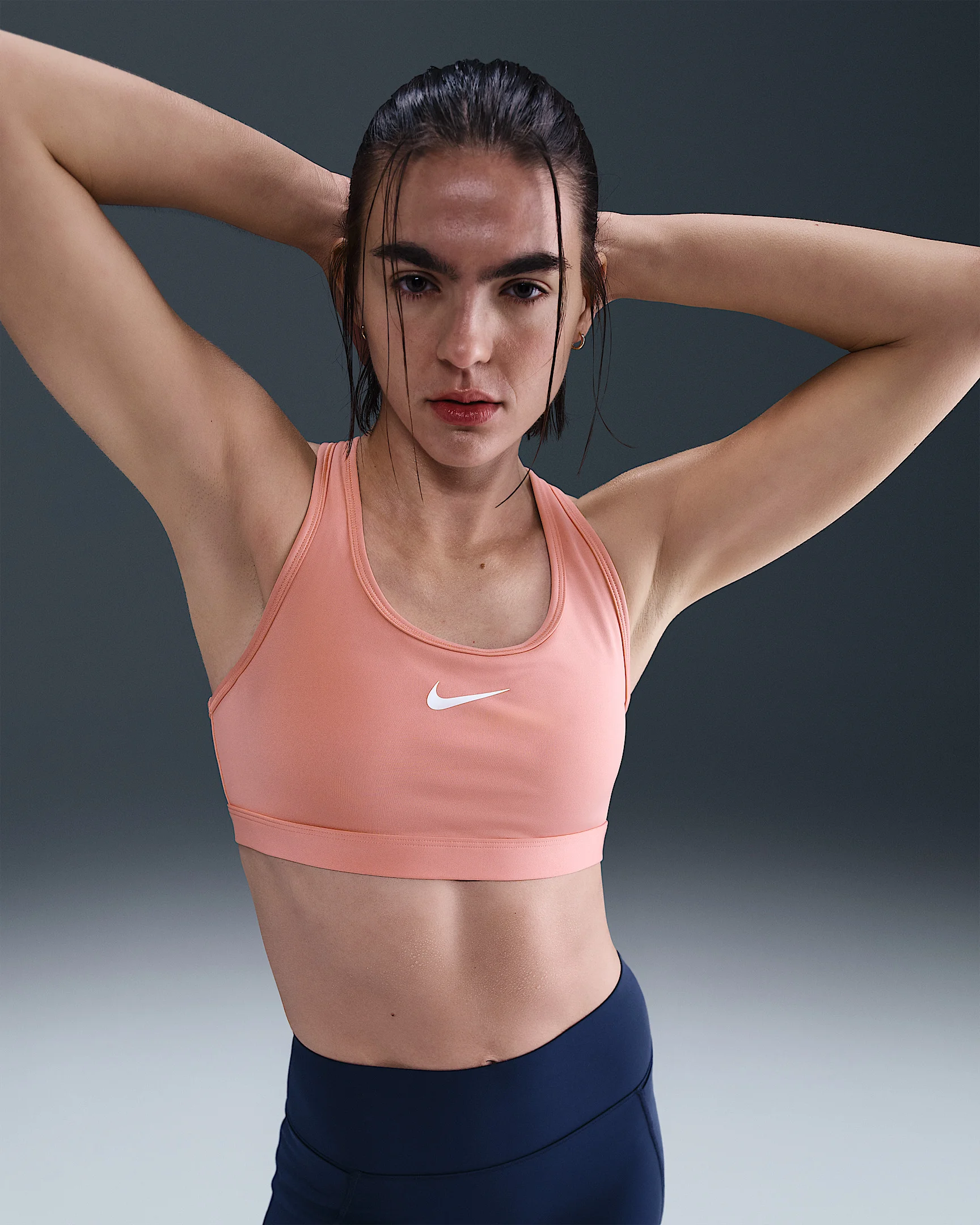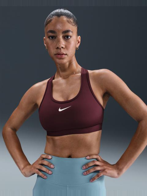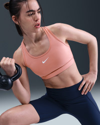 You're on the move. Your padding shouldn't be. This Swoosh bra's sewn-in pads stay in place so you can work hard without worrying about them shifting or folding. Great for training workouts and dance classes, medium support gives you a snug hold that helps keep everything in place. Plus, sweat-wicking, adaptive material quickly recovers its shape so you can stay comfortable throughout your workout. Product Details - Body: 72% polyester/28% spandex. Mesh: 81% polyester/19% spandex. Back lining: 72% polyester/28% spandex. Pad back fabric: 100% polyester. Pad: 100% polyurethane. - Machine wash - Imported - Shown: Rust Pink/White - Style: DX6821-685 SIZE & FIT Model is wearing size S Model height: 5′7″170cm Model bust: 31″79cm Tight fit: snug and form-fitting Medium support: feels ke a snug hold to keep everything in place
