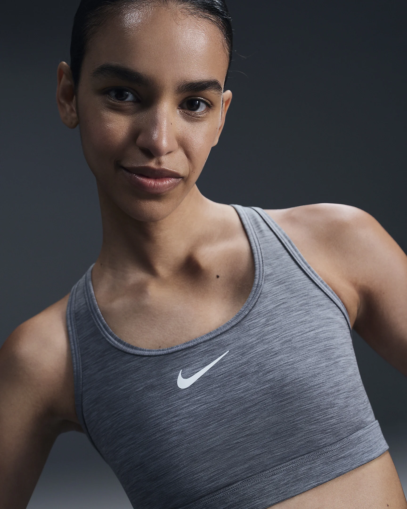 You're on the move. Your padding shouldn't be. This Swoosh bra's sewn-in pads stay in place so you can work hard without worrying about them shifting or folding. Great for training workouts and dance classes, medium support gives you a snug hold that helps keep everything in place. Plus, sweat-wicking, adaptive material quickly recovers its shape so you can stay comfortable throughout your workout. Product Details - Body: 72% polyester/28% spandex. Mesh: 81% polyester/19% spandex. Back lining: 72% polyester/28% spandex. Pad back fabric: 100% polyester. Pad: 100% polyurethane. - Machine wash - Imported - Shown: Smoke Grey/Pure/White - Style: DX6821-086 SIZE & FIT Model is wearing size S Model height: 5′11″180cm Model bust: 30″76cm Tight fit: snug and form-fitting Medium support: feels ke a snug hold to keep everything in place Fits large; we recommend ordering a size down