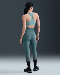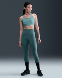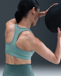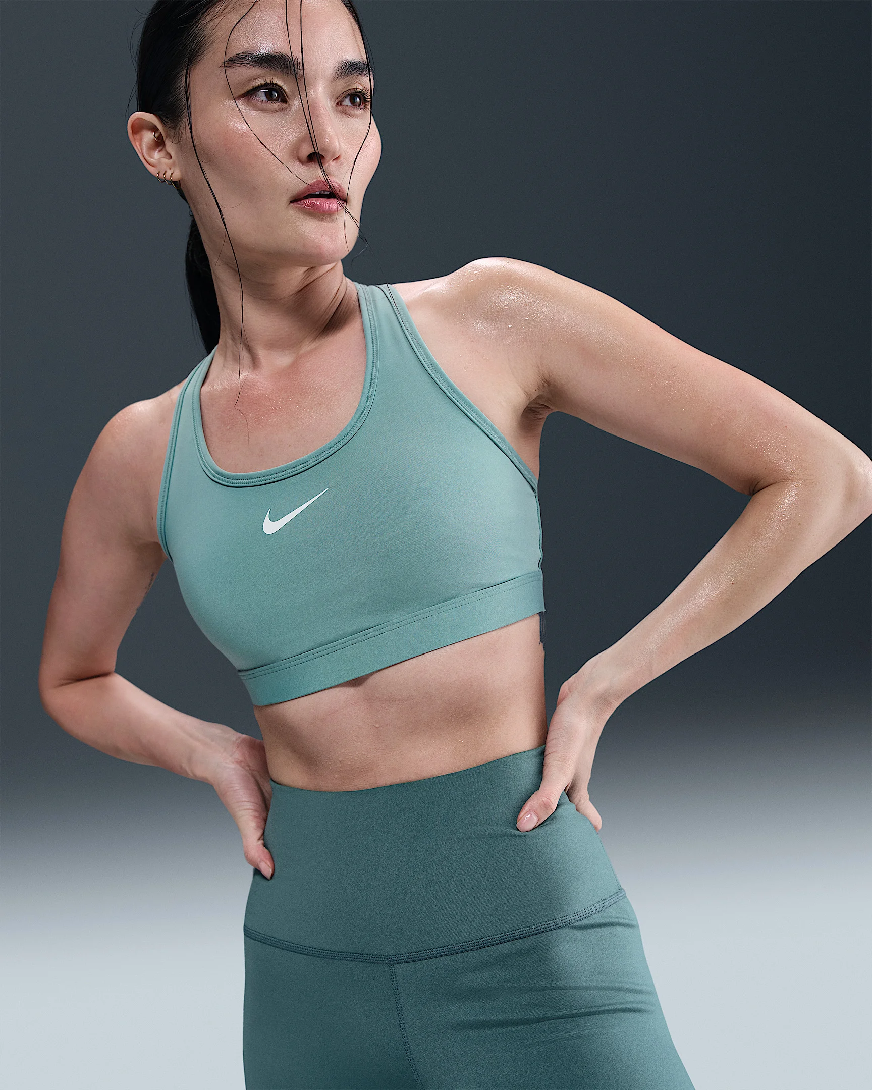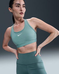 You're on the move. Your padding shouldn't be. This Swoosh bra's sewn-in pads stay in place so you can work hard without worrying about them shifting or folding. Great for training workouts and dance classes, medium support gives you a snug hold that helps keep everything in place. Plus, sweat-wicking, adaptive material quickly recovers its shape so you can stay comfortable throughout your workout. Product Details - Body: 72% polyester/28% spandex. Mesh: 81% polyester/19% spandex. Back lining: 72% polyester/28% spandex. Pad back fabric: 100% polyester. Pad: 100% polyurethane. - Machine wash - Imported - Shown: Cannon/White - Style: DX6821-017 SIZE & FIT Model is wearing size S Model height: 5′7″170cm Model bust: 32″81cm Tight fit: snug and form-fitting Medium support: feels ke a snug hold to keep everything in place