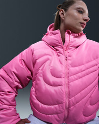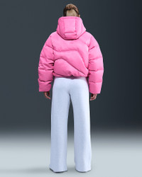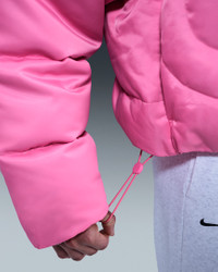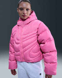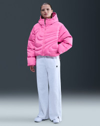 Bundle up in this next-level puffer. Engineered with maximum down insulation and water-repellent fabric, it’s our warmest option in the Swoosh Series Collection. We added fleece-lined cuffs and bungees at the hood and hem so you’re ready to cinch out the cold. Product Details - Body/Lining: 100% polyester. Fill: grey duck down (minimum 75% down)/(APA Version: 75% grey duck down/25% feathers). - Oversized fit - Side and internal pockets - Machine wash - Imported - Shown: Pink Spell/Pink Spell - Style: IB2005-606 SIZE & FIT Model is wearing size S and is 5′10″178cm Oversized fit: exaggerated and spacious