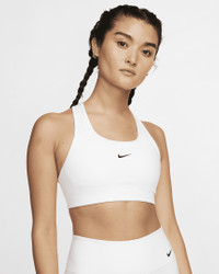 The Nike Swoosh Sports Bra gives you classic coverage and medium support for activities like spin, cardio and dance classes. The removable padding has been redesigned to reliably stay in place while you work out. This product is made with at least 75% recycled polyester fibers. Product Details - Tight fit for a body-hugging feel - Body/lining: 82% polyester/18% spandex. Bottom hem: 49% polyester/26% nylon/25% rubber. Interlining: 80% polyester/20% spandex. Pad top fabric/pad back fabric: 100% polyester. Pad: 100% polyurethane. - Machine wash - Imported - Shown: White/Black - Style: BV3636-100 SIZE & FIT Tight fit: snug and form-fitting Medium support: feels ke a snug hold to keep everything in place