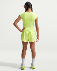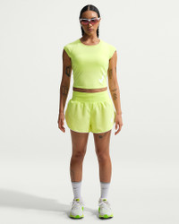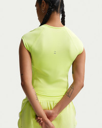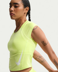 Pick up the pace in this top. Smooth and sweat-wicking, it helps keep you dry and comfortable. Its slightly cropped fitted design gives you minimal bulk for a distraction-free run. Benefits - Nike Dri-FIT technology moves sweat away from your skin for quicker evaporation, helping you stay dry and comfortable. - Raglan sleeves are designed to help reduce underarm chafing and allow for a wider range of motion. Product Details - Swoosh logo graphic - Body: 100% polyester - Machine wash - Imported - Not intended for use as Personal Protective Equipment (PPE) - Shown: Light Lemon Twist/Photon Dust/White - Style: IF4998-736 SIZE & FIT Sm fit: sleek and tailored
