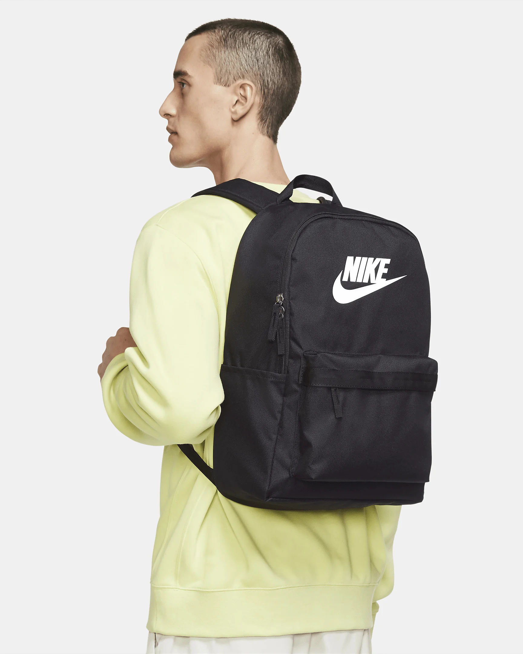 Take your gear to go with the Nike Heritage Backpack. Its spacious main compartment features a sleeve that holds up to a 15" laptop, so your computer is never out of reach. 2 zippered accessories pockets help keep your gear organized and easy to grab. This product is made with at least 65% recycled polyester fibers. Benefits - The extra zipper compartments help keep you organized, add convenience and secure your keys, wallet and phone. - Densely woven polyester provides heavyweight support. - The shoulder straps and back are padded for extra comfort. Product Details - Haul handle - 17" H x 12" W x 6" D - 25 L - 100% polyester - Spot clean - Imported - Shown: Black/Black/White - Style: DC4244-010