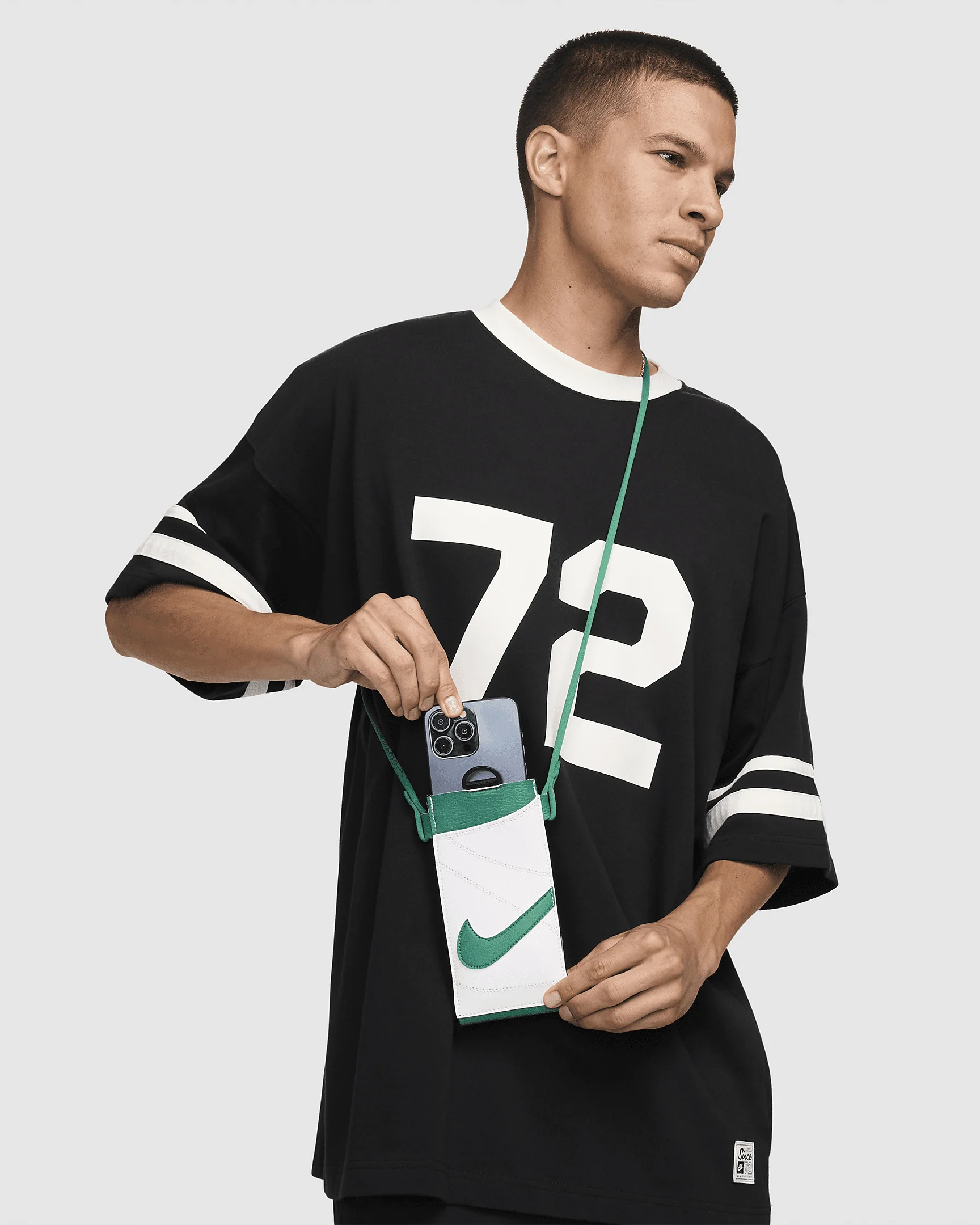 Free up your hands and pockets with the Nike Premium phone bag. A tech-touch window lets you use your device without having to pull it out of the bag, helping you stay connected while on the go. An adjustable strap lets you change up your styling while premium metal hardware easily attaches to other accessories like your keys. Product Details - 0.7"W x 7"H x 3.5"D - 34% nylon/27% PU leather/15% thermoplastic polyurethane (TPU)/12% polyester/7% polyoxymethylene (POM)/5% zinc alloy - Spot clean - Imported - Shown: Green - Style: N1010036-311