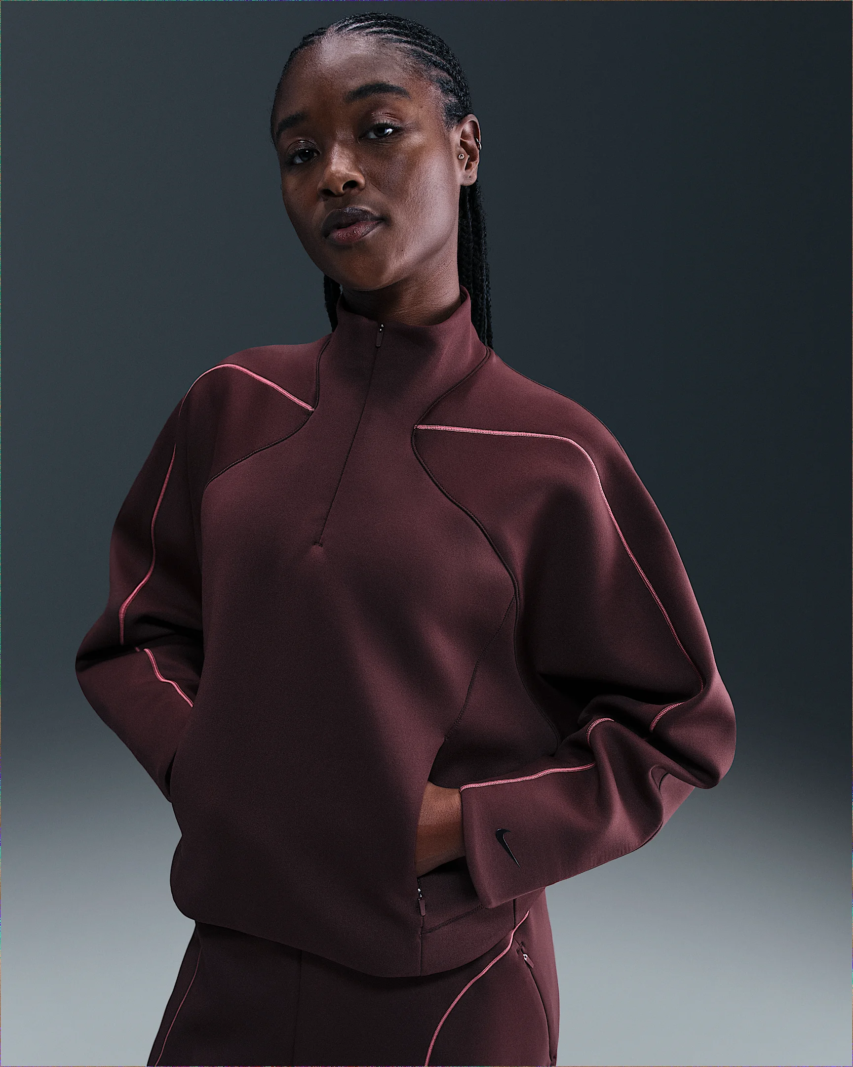 Polished but ready to work. Irresistibly smooth and sleek, this top feels soft and airy and has the perfect amount of flex and stretch for all of your moves. Benefits - Nike Dri-FIT technology moves sweat away from your skin for quicker evaporation, helping you stay dry and comfortable. - Discreet zip pockets at front secure your essentials. - Loose fit for a roomy feel. Product Details - Elegant design lines - Gloss silicone Swoosh logo - Body: 93% polyester/7% spandex. Pocket bags: 75% polyester/13% cotton/12% rayon. - Machine wash - Imported - Shown: Burgundy Crush/Sweet Beet/Burgundy Ash - Style: HV3575-652 SIZE & FIT Model is wearing size S and is 5′8″173cm Loose fit: roomy and relaxed