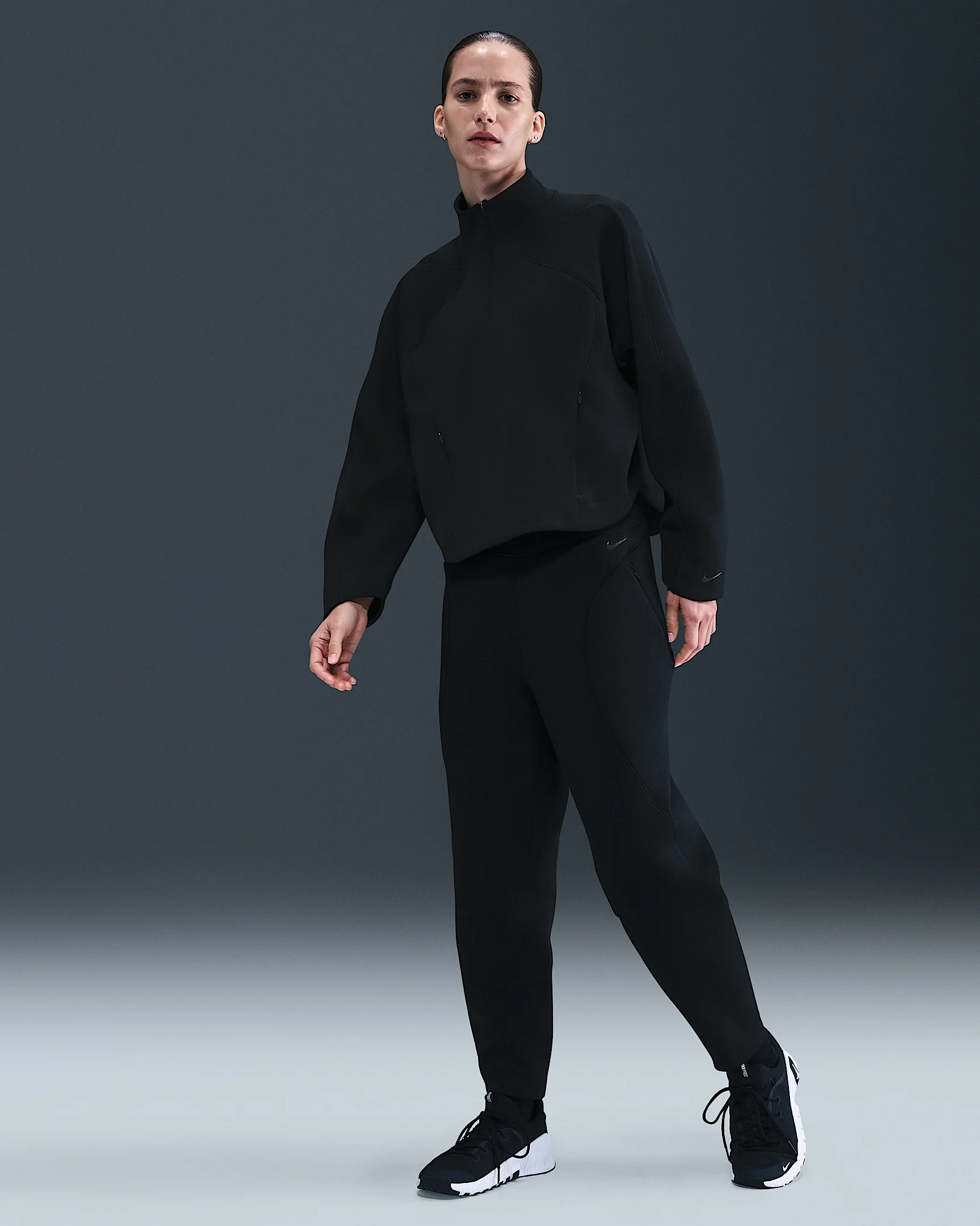 These pants are sleek and ready to move. Made with sweat-wicking tech and smooth premium fabric, they give you the perfect amount of flex and stretch for comfort in every activity. Benefits - Nike Dri-FIT technology moves sweat away from your skin for quicker evaporation, helping you stay dry and comfortable. - Irresistibly smooth and sleek, this premium fabric feels soft and airy. - Hidden drawcord lets you customize your fit. - Discreet zippers on side pockets offer secure storage with a smooth look. Product Details - Gloss silicone Swoosh logo - Elegant seam lines - Body: 93% polyester/7% spandex - Machine Wash - Imported - Shown: Black/Black/Dark Smoke Grey - Style: HV3585-010 SIZE & FIT Model is wearing size S and is 5′10″178cm Loose fit: roomy and relaxed 78 length: hits at ankle
