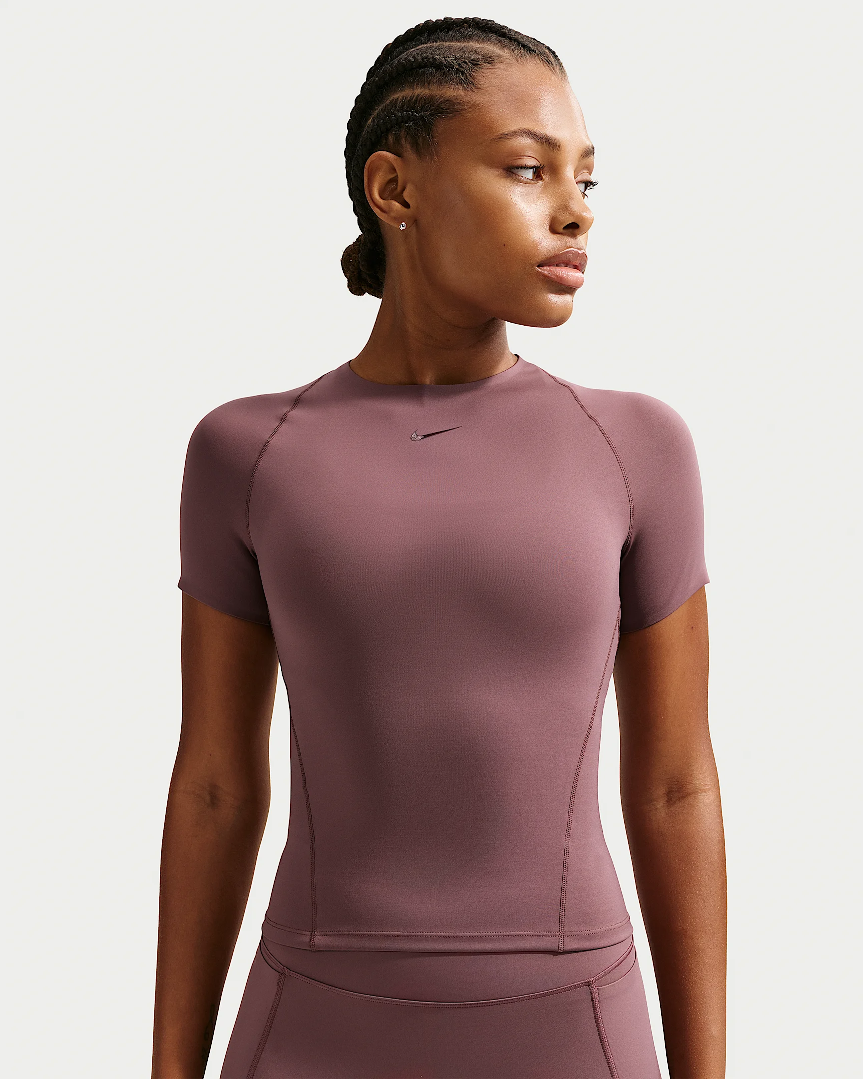 Don't let 'em see you sweat. Ultrasmooth and sleek, this stretchy Universa top has moisture-concealing technology and feels cool to the touch—so you can go all out in confidence. Benefits - Nike Stealth Evaporation technology helps reduce sweat marks by dispersing moisture so the fabric dries quickly and stays looking fresh. - Nike Dri-FIT technology moves sweat away from your skin for quicker evaporation, helping you stay dry and comfortable. - Ultrasmooth and sleek, this midweight fabric feels cool to the touch and offers a smooth look. Product Details - Gloss silicone Swoosh logo - 78% polyester/22% spandex - Machine wash - Imported - Shown: Tattoo/Tattoo/Burgundy Crush - Style: IO1271-502 SIZE & FIT Model is wearing size S and is 5'11"179cm Tight fit: snug and form-fitting